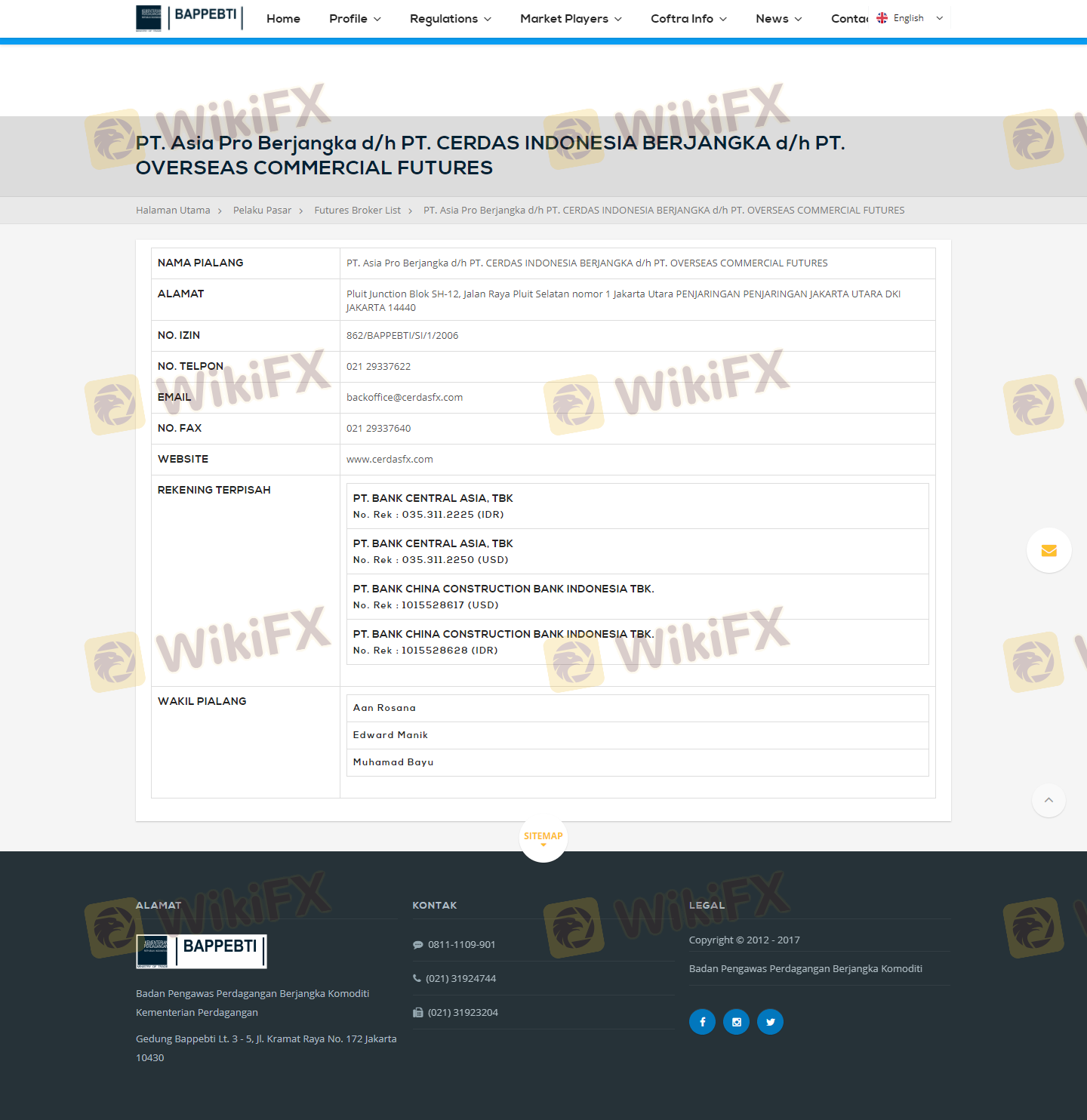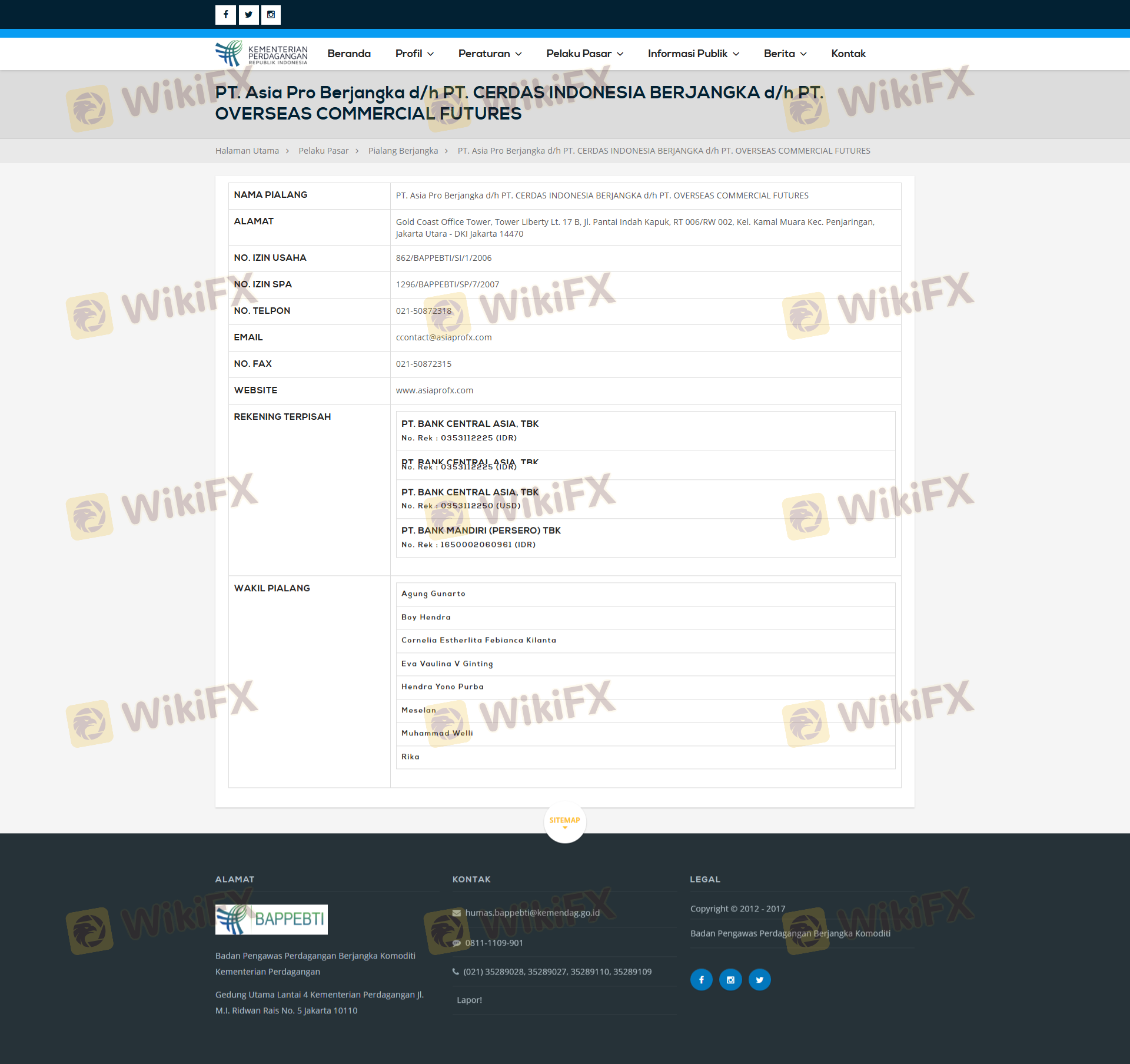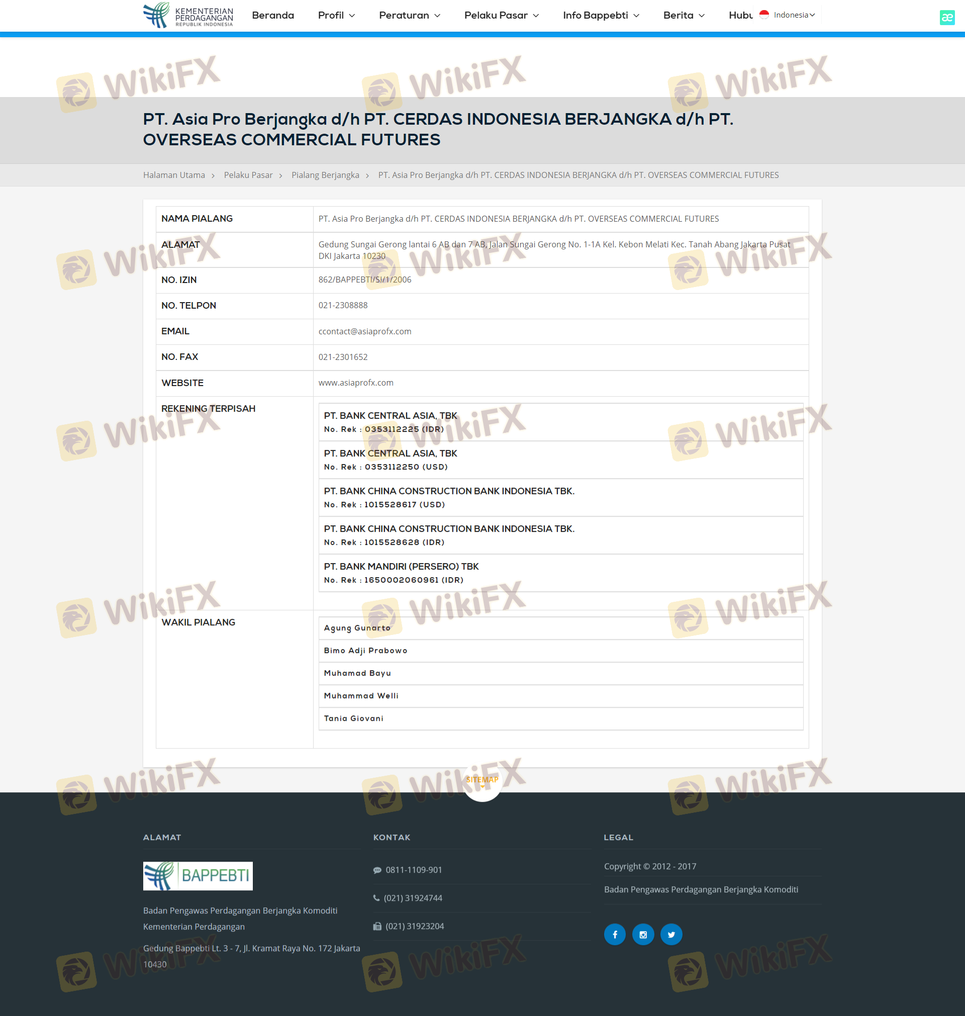 Mengenai legitimasi broker forex ASIAPRO, ia menyediakan Indonesia BAPPEBTI, dan (Kami juga melakukan investigasi lapangan terkait aspek keamanan.).