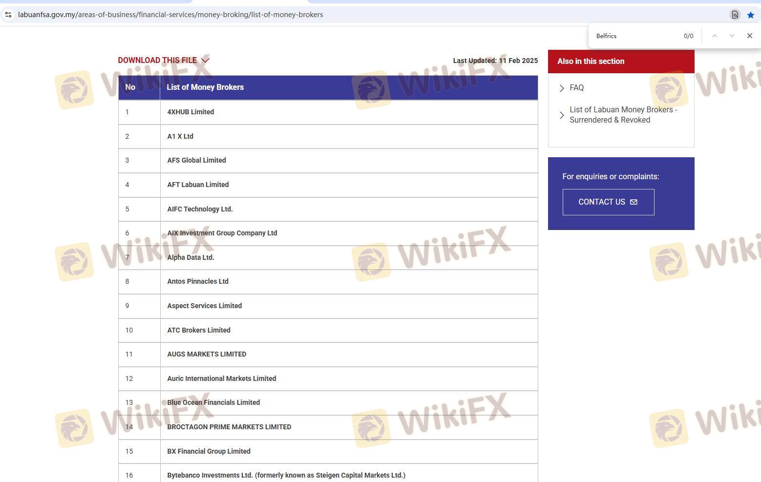 Salah satu faktor utama yang menentukan keamanan broker forex adalah status regulasinya. Belfrics Prime mengklaim diatur oleh Labuan Financial Services Authority (LFSA) di Malaysia. Namun, ada kekhawatiran mengenai validitas regulasi ini, karena telah digambarkan sebagai mencurigakan dan berpotensi sebagai klon. Tabel berikut merangkum informasi inti regulasi untuk Belfrics Prime: