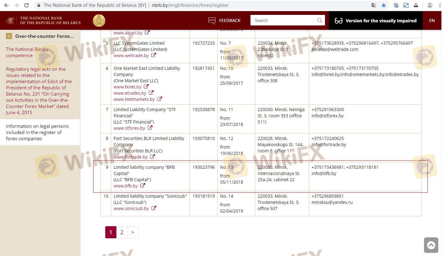 Mengenai legitimasi broker forex BFB Capital , ia menyediakan Belarus NBRB, dan (Kami juga melakukan investigasi lapangan terkait aspek keamanan.).