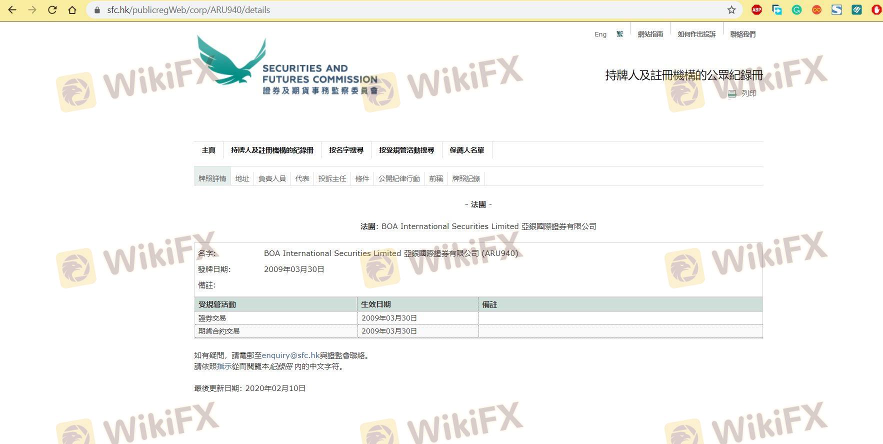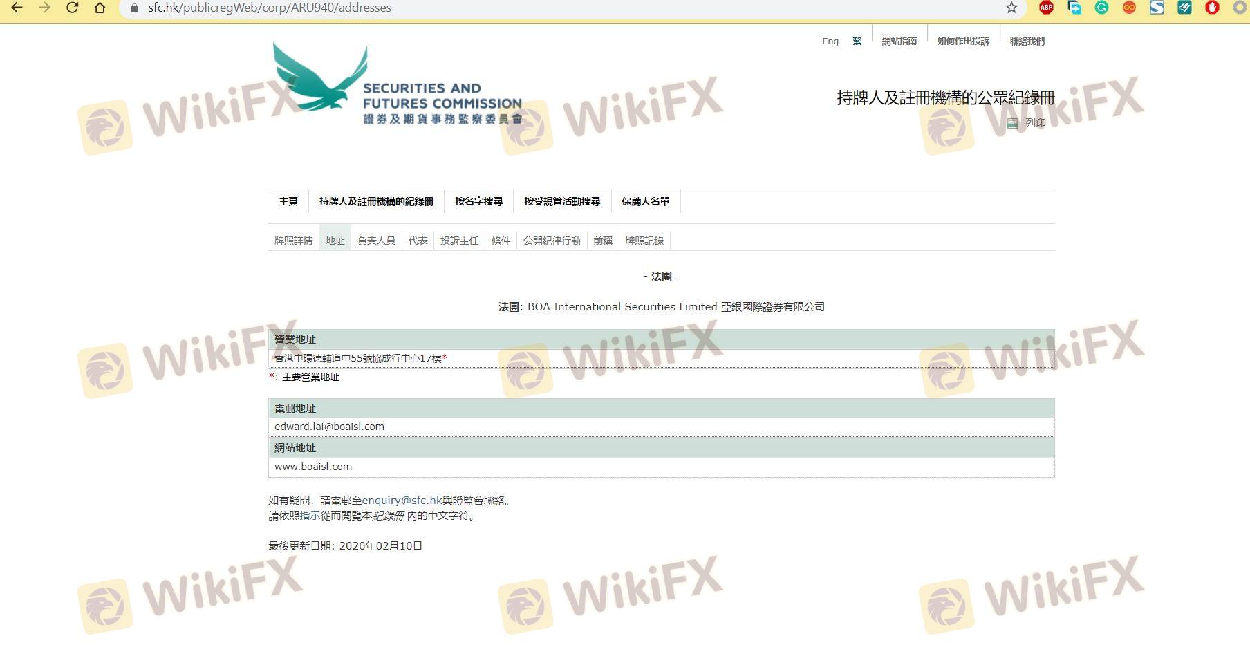 Mengenai legitimasi broker forex BOA, ia menyediakan Hong Kong SFC, dan (Kami juga melakukan investigasi lapangan terkait aspek keamanan.).