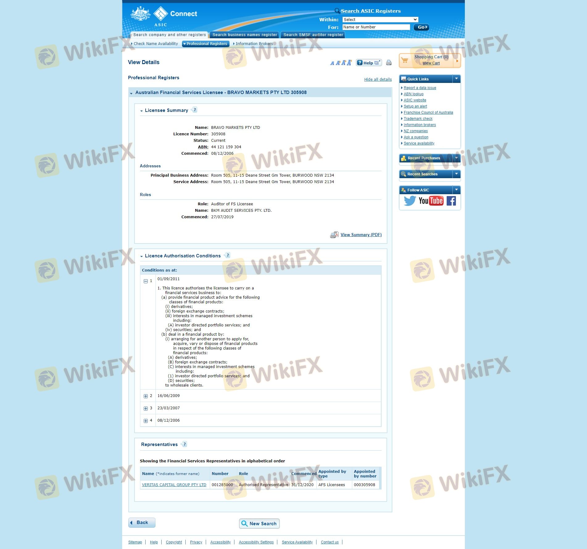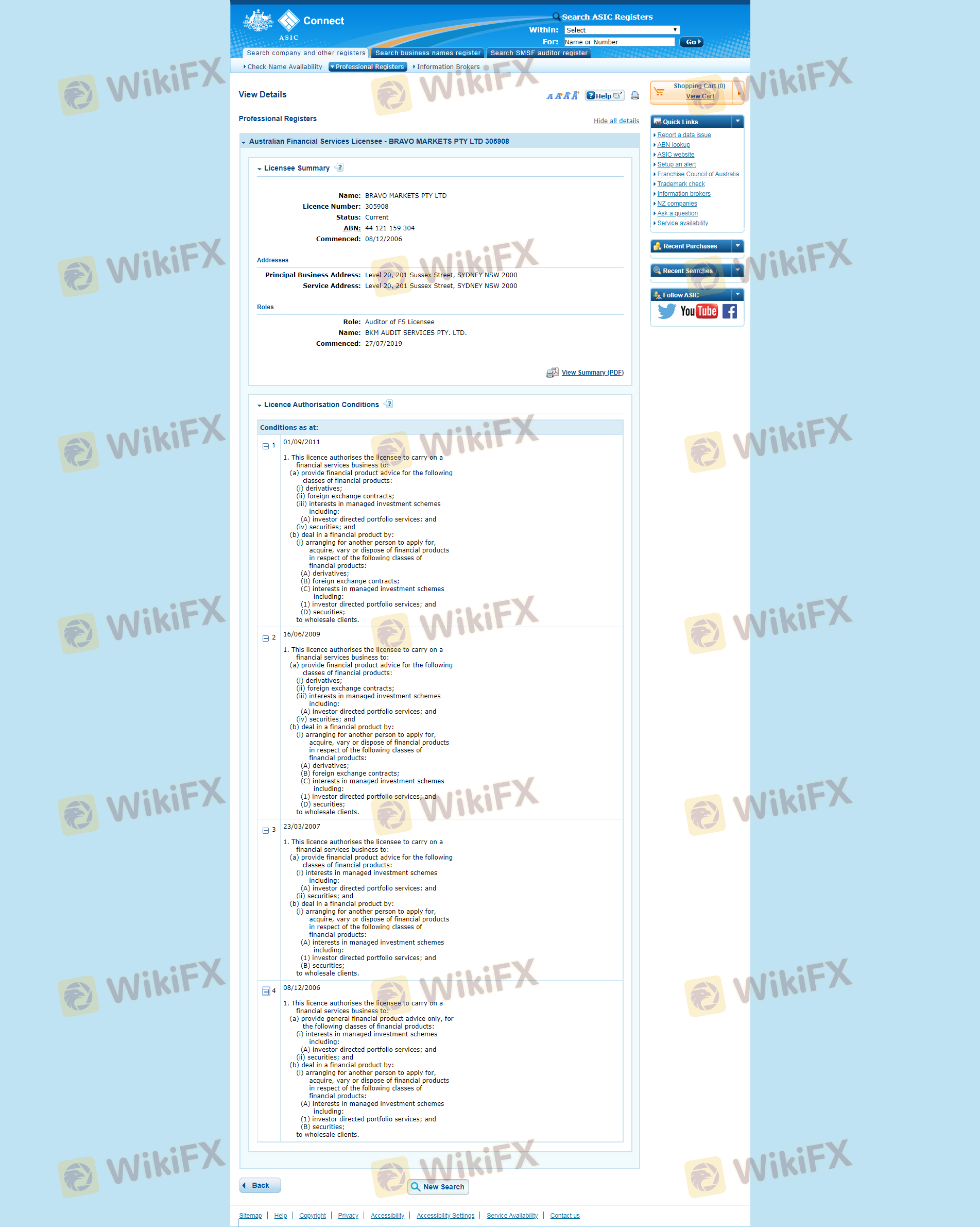 Status regulasi seorang broker adalah aspek penting yang menentukan legitimasi dan keandalannya. Bravo Markets mengklaim terdaftar di Australia dan menyatakan kepatuhan terhadap Komisi Sekuritas dan Investasi Australia (ASIC). Namun, klaim ini sedang diteliti, karena banyak sumber mengategorikan Bravo Markets sebagai "klon mencurigakan" dari broker yang sah. Hal ini menimbulkan tanda bahaya yang signifikan terkait kepatuhan regulasinya.