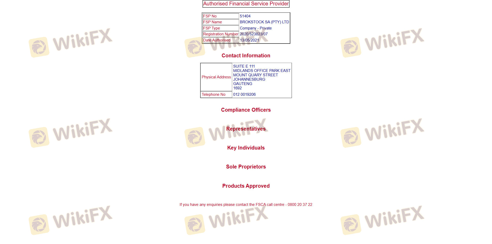 Brokstock beroperasi di bawah pengawasan Financial Sector Conduct Authority (FSCA) di Afrika Selatan. Regulasi sangat penting dalam industri trading untuk memastikan broker mematuhi standar keuangan dan praktik etika, sehingga melindungi kepentingan trader.