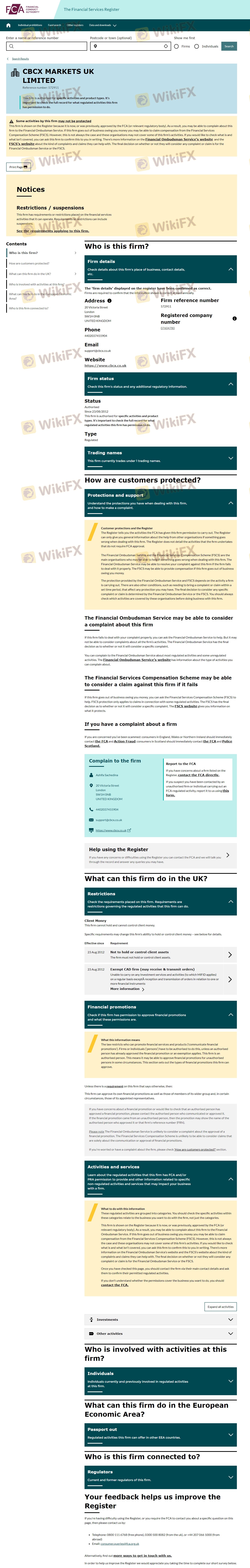 Mengenai legitimasi broker forex CBCX, ia menyediakan Kerajaan Inggris FCA, Afrika Selatan FSCA, dan (Kami juga melakukan investigasi lapangan terkait aspek keamanan.).