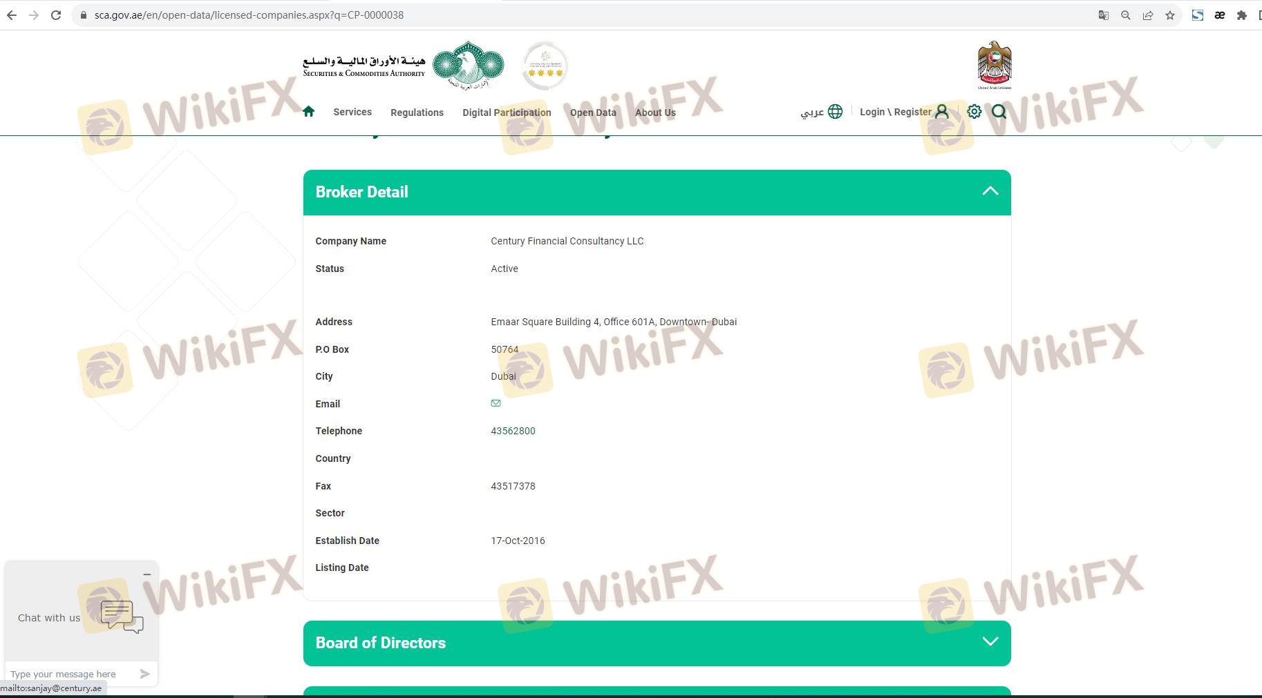 Status regulasi sebuah perusahaan pialang adalah faktor kritis dalam menilai legitimasinya. Century Financial diatur oleh Otoritas Sekuritas dan Komoditas (SCA) dari UEA. Pengawasan regulasi sangat penting karena menerapkan standar yang harus dipatuhi oleh pialang, seperti mempertahankan cadangan modal yang memadai dan memastikan dana klien dilindungi. Berikut adalah ringkasan informasi regulasi Century Financial: