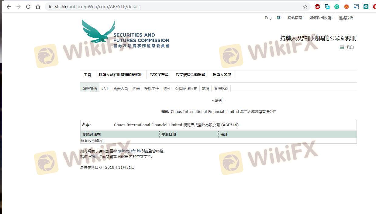 Mengenai legitimasi broker forex CHAOS, ia menyediakan China CFFEX, Hong Kong SFC, Hong Kong SFC, dan (Kami juga melakukan investigasi lapangan terkait aspek keamanan.).