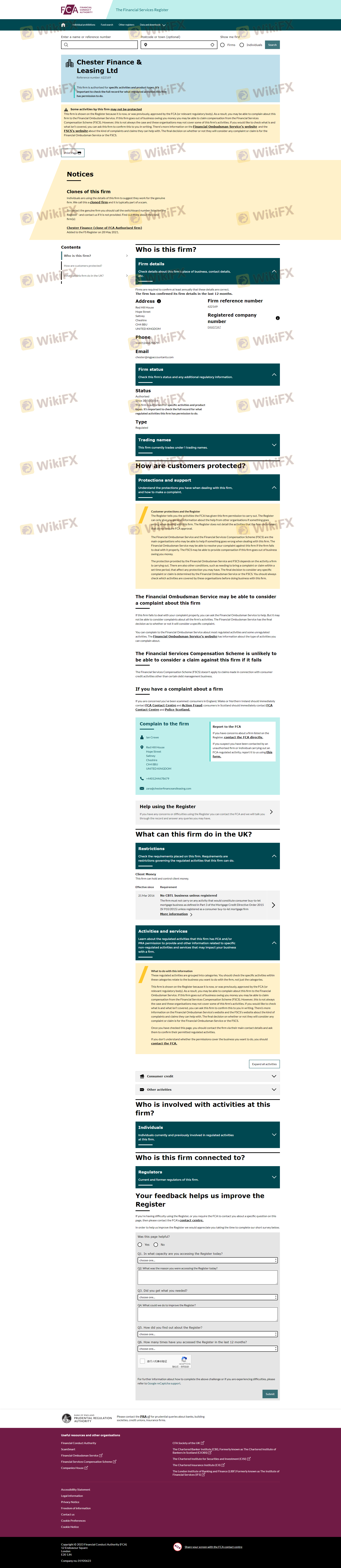 Lingkungan regulasi sangat penting dalam menentukan keamanan seorang pialang forex. Seorang pialang yang terregulasi tunduk pada pengawasan ketat, yang membantu melindungi trader dari penipuan dan praktik-praktik buruk. Chester Finance telah diidentifikasi sebagai "kloning perusahaan" oleh Financial Conduct Authority (FCA) Inggris, yang berarti pialang ini menggunakan nama dan detail perusahaan yang sah tanpa izin. Hal ini menimbulkan kekhawatiran signifikan tentang keabsahan dan praktik operasionalnya.