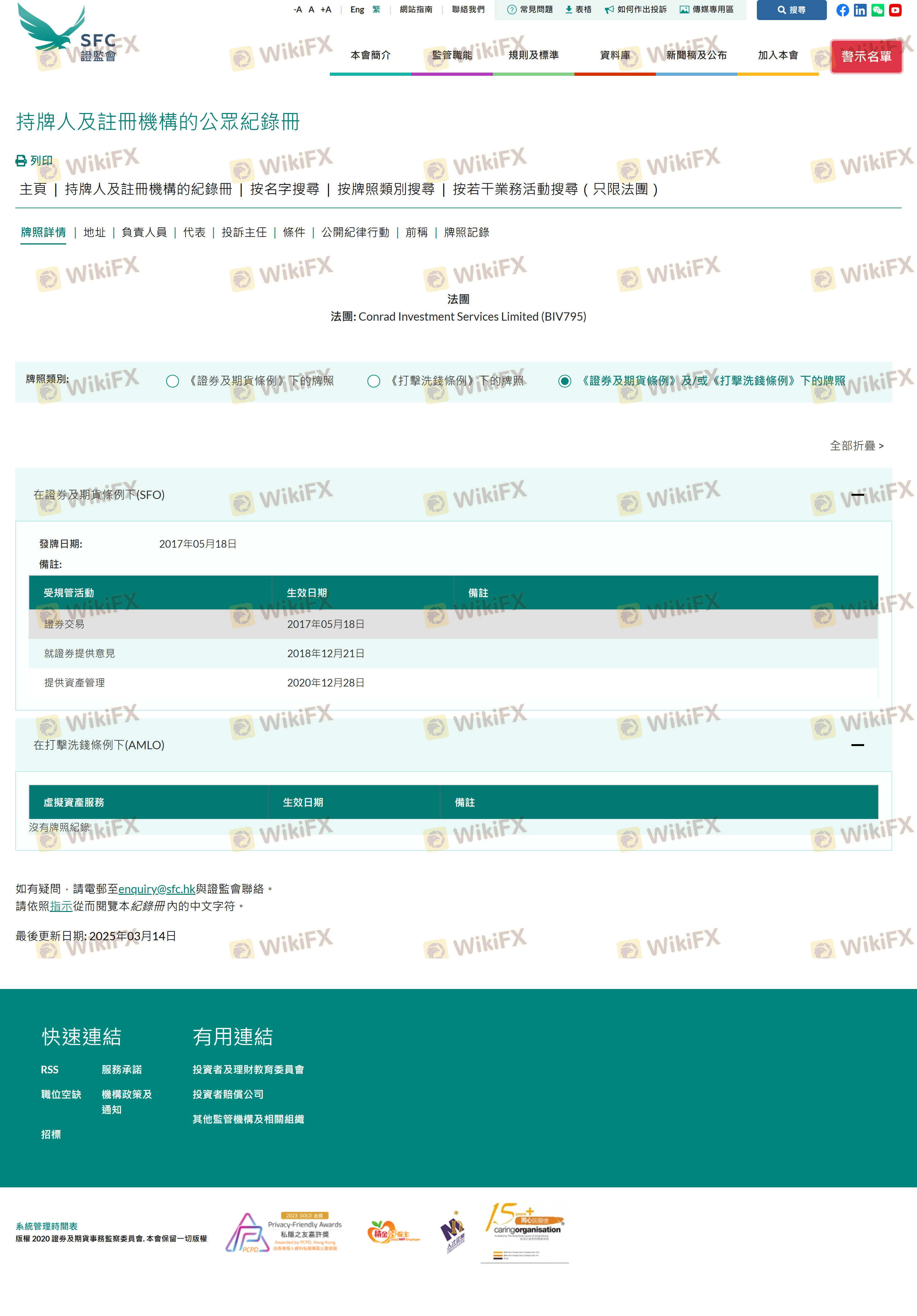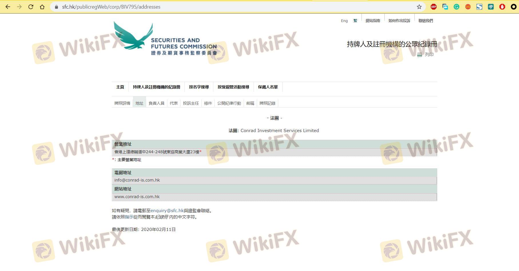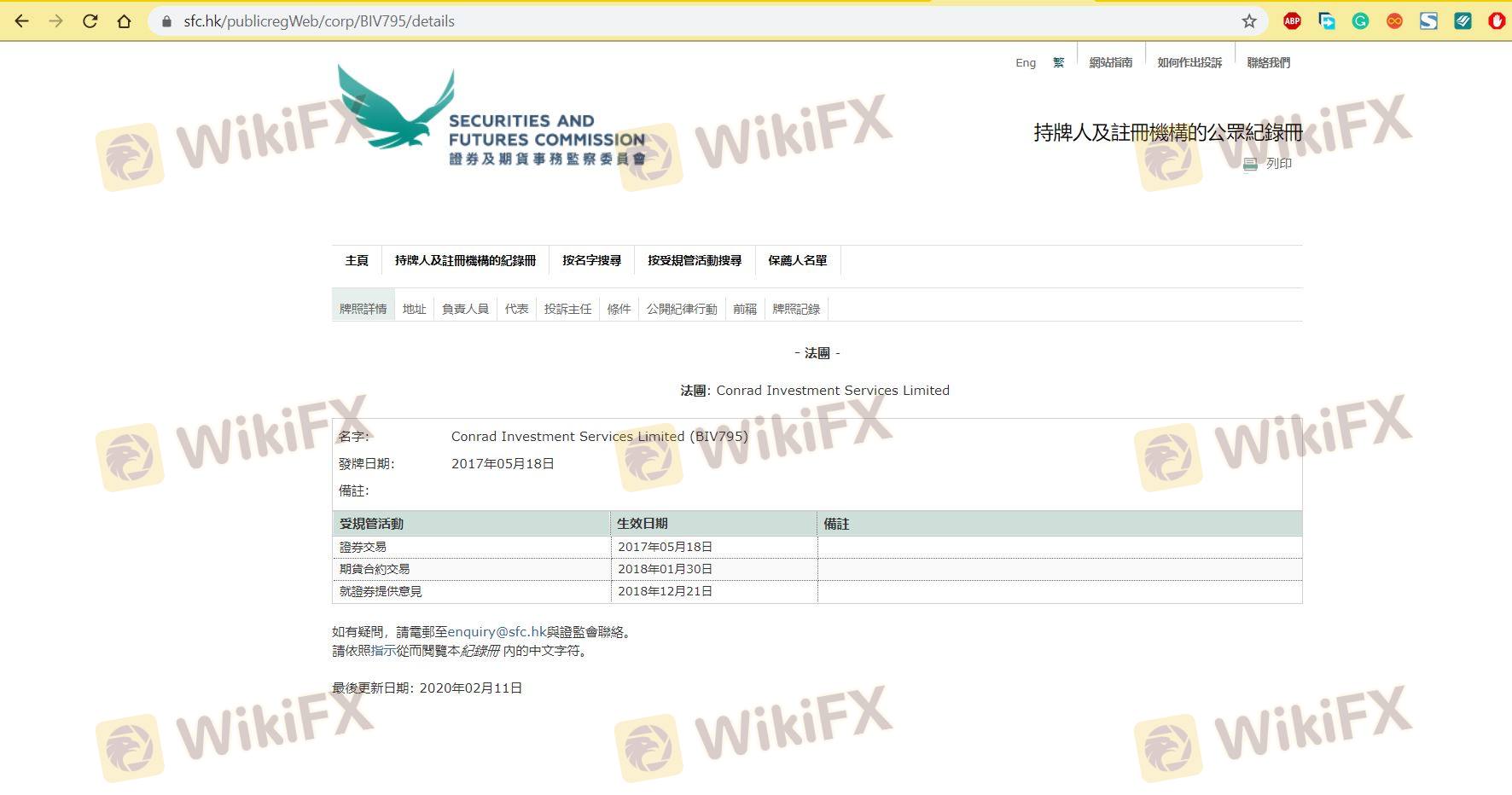 Mengenai legitimasi broker forex CONRAD, ia menyediakan Hong Kong SFC, dan (Kami juga melakukan investigasi lapangan terkait aspek keamanan.).
