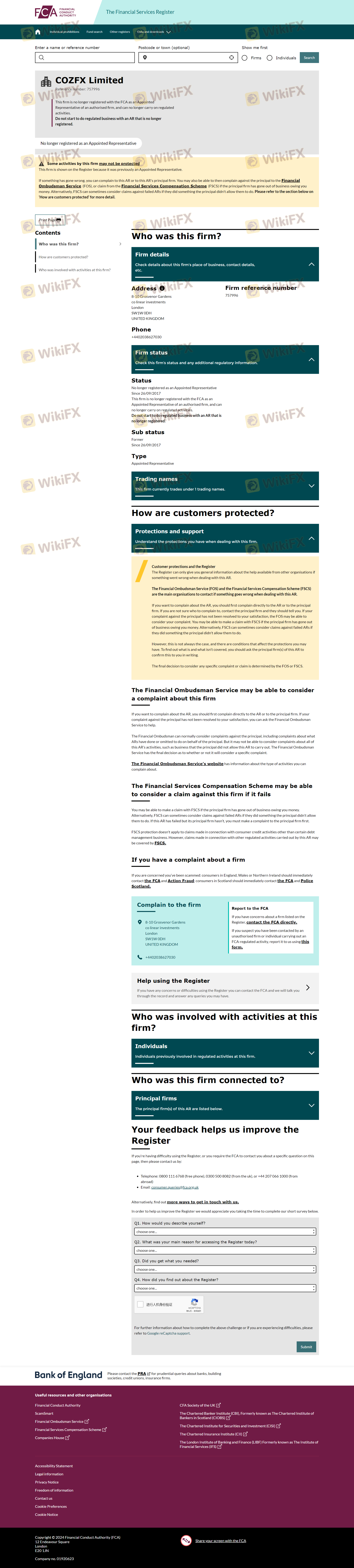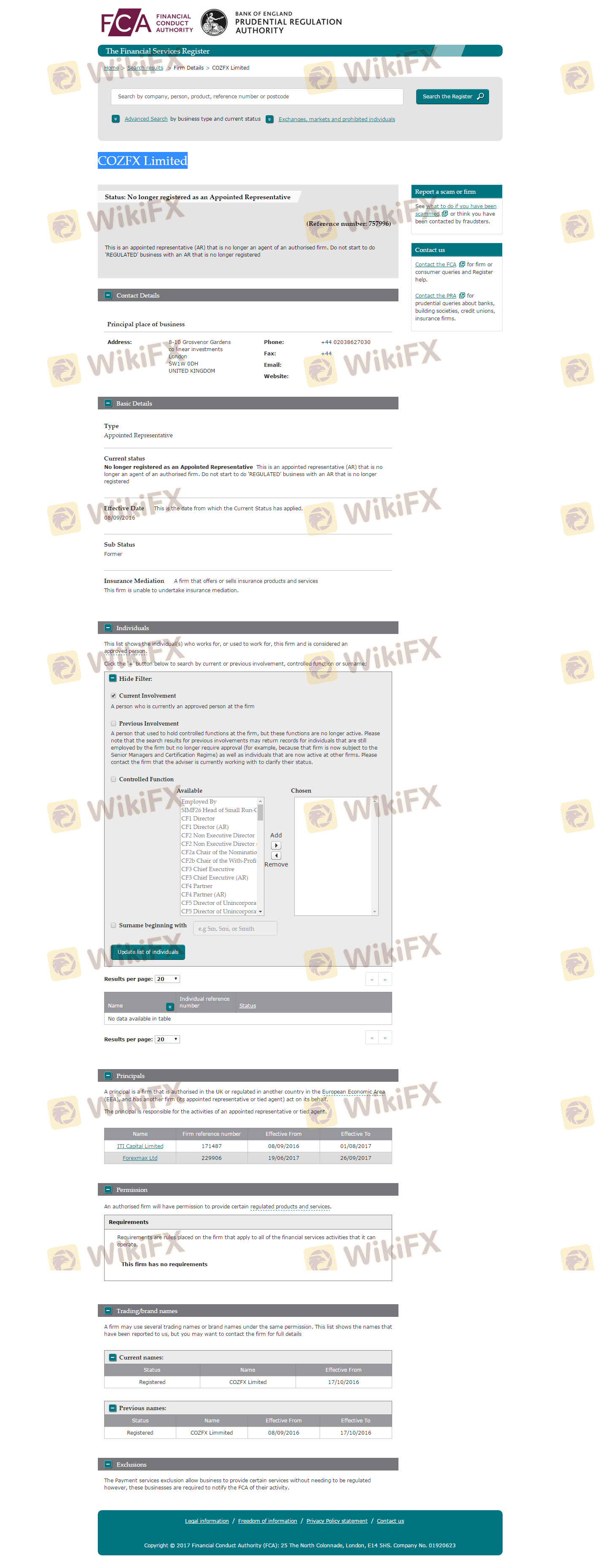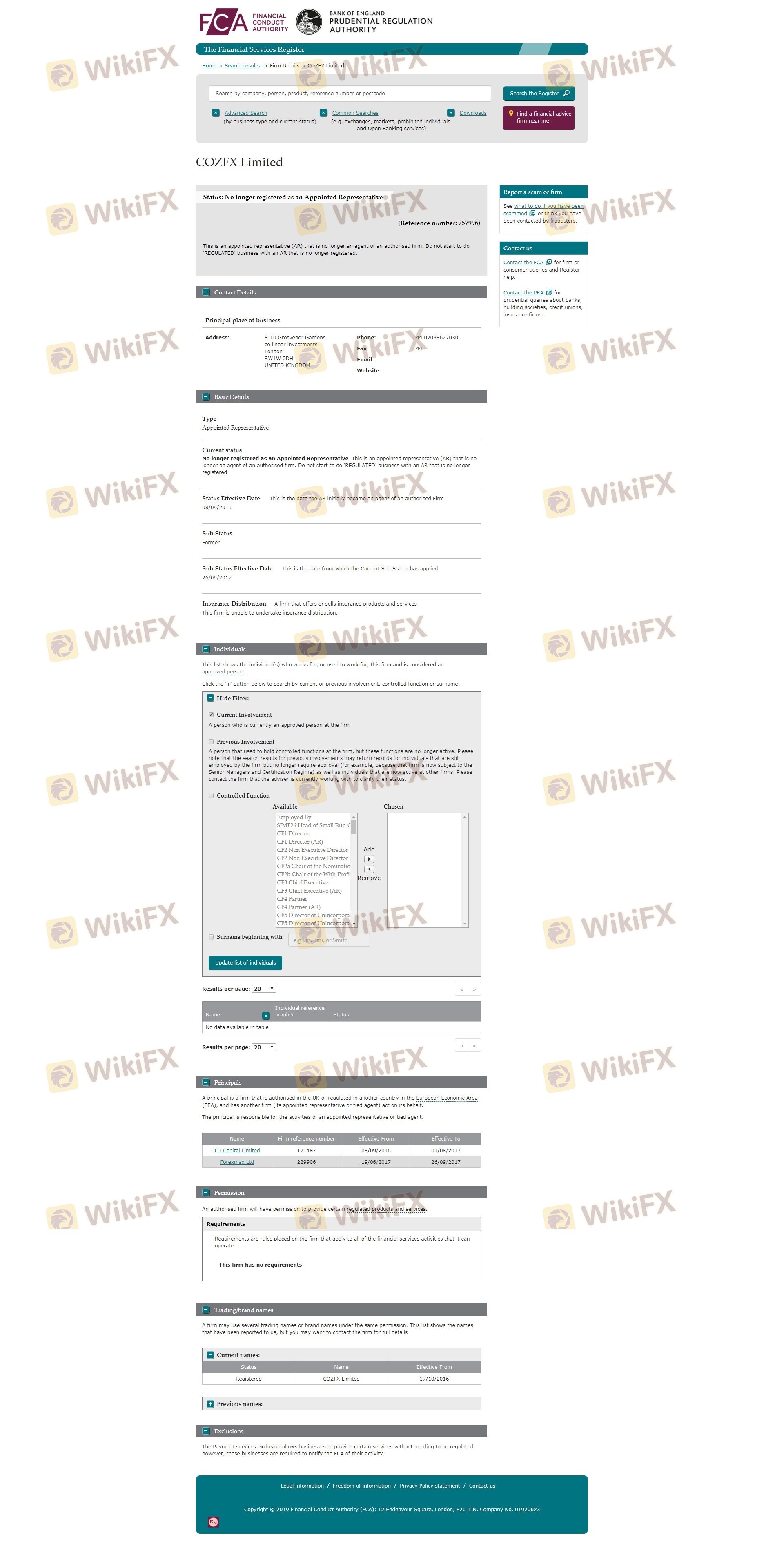 Mengenai legitimasi broker forex COZFX, ia menyediakan Kerajaan Inggris FCA, dan (Kami juga melakukan investigasi lapangan terkait aspek keamanan.).