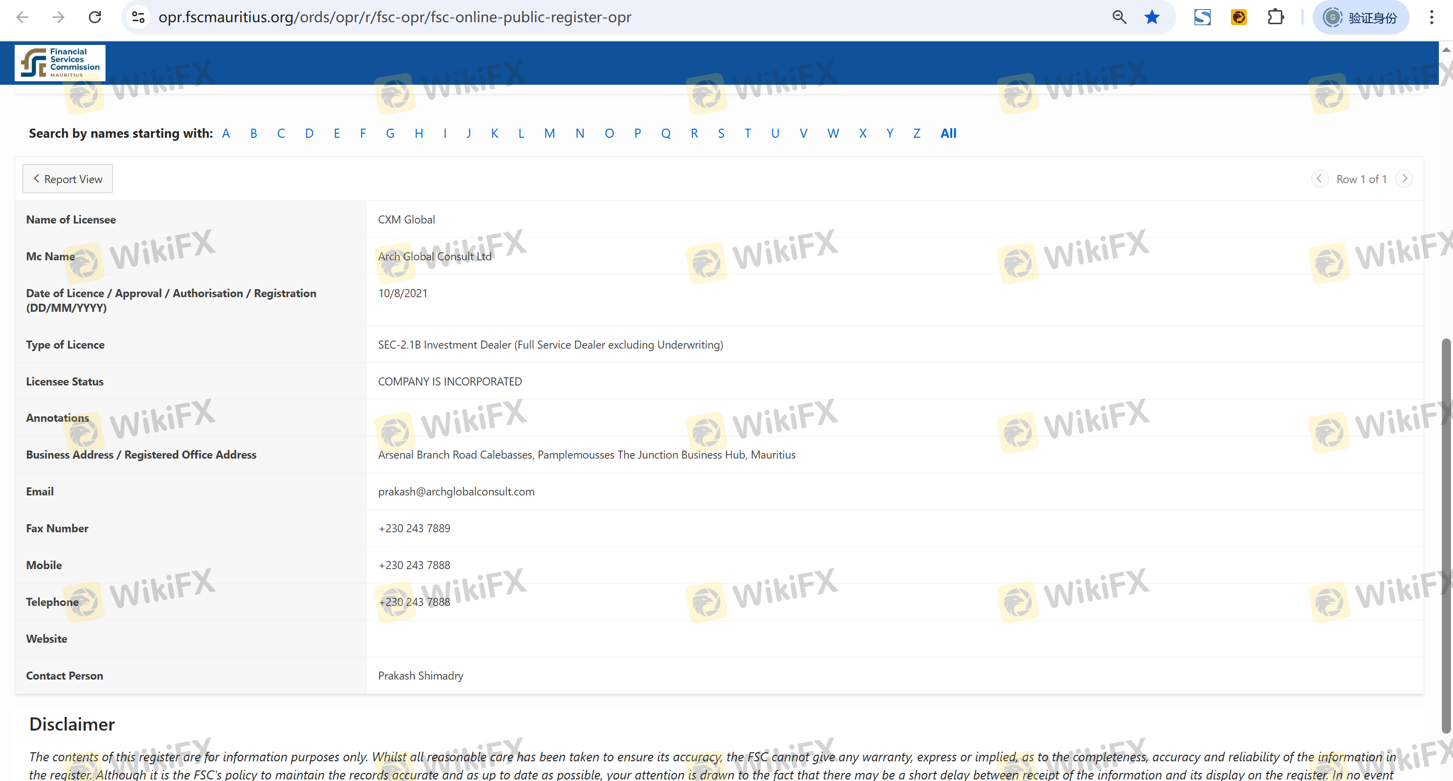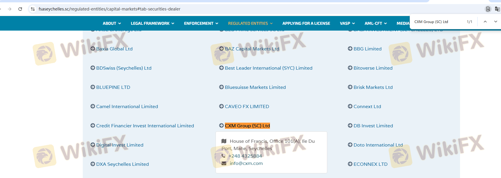 Mengenai legitimasi broker forex CXM, ia menyediakan Kerajaan Inggris FCA, Seychelles FSA, Mauritius FSC, dan (Kami juga melakukan investigasi lapangan terkait aspek keamanan.).
