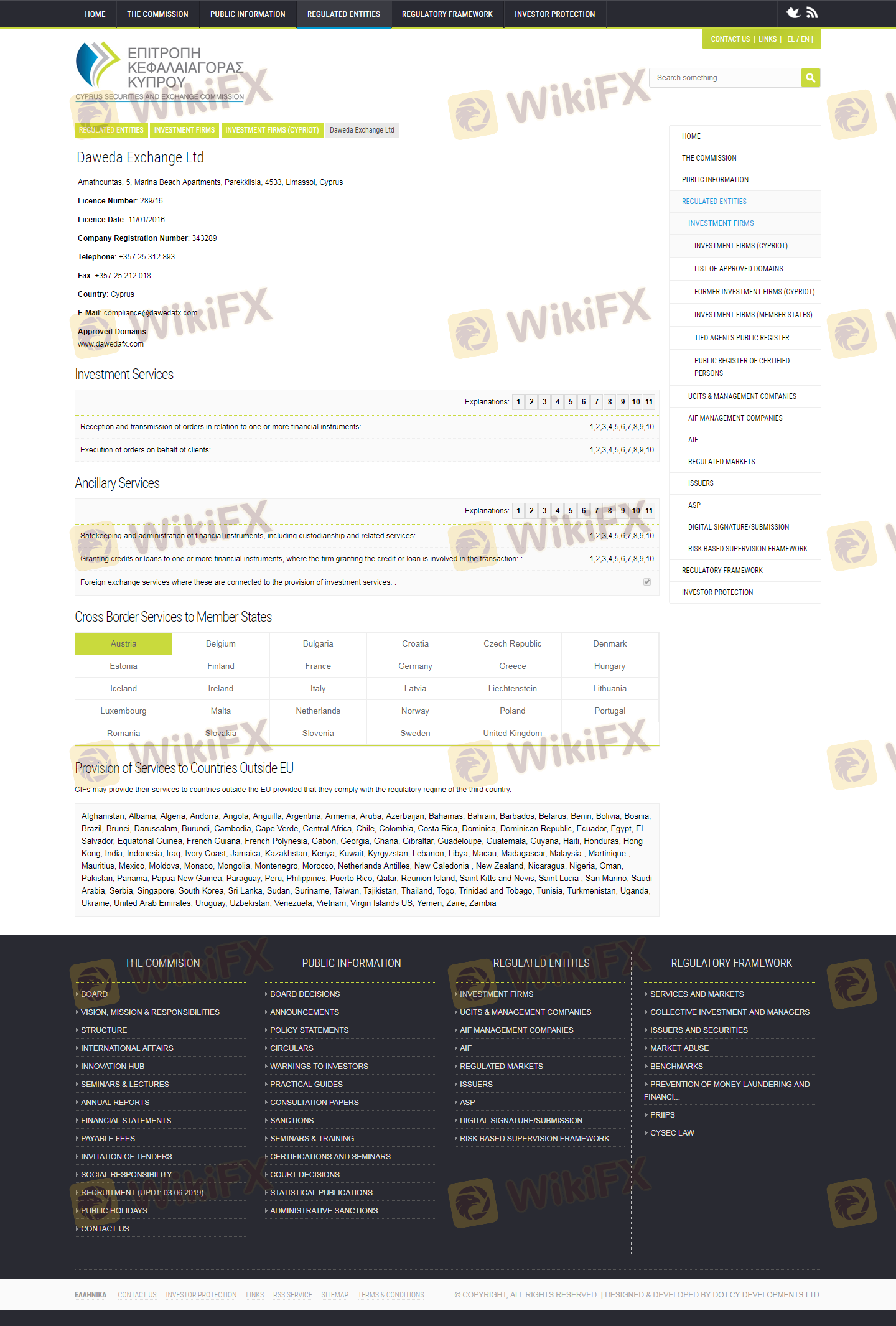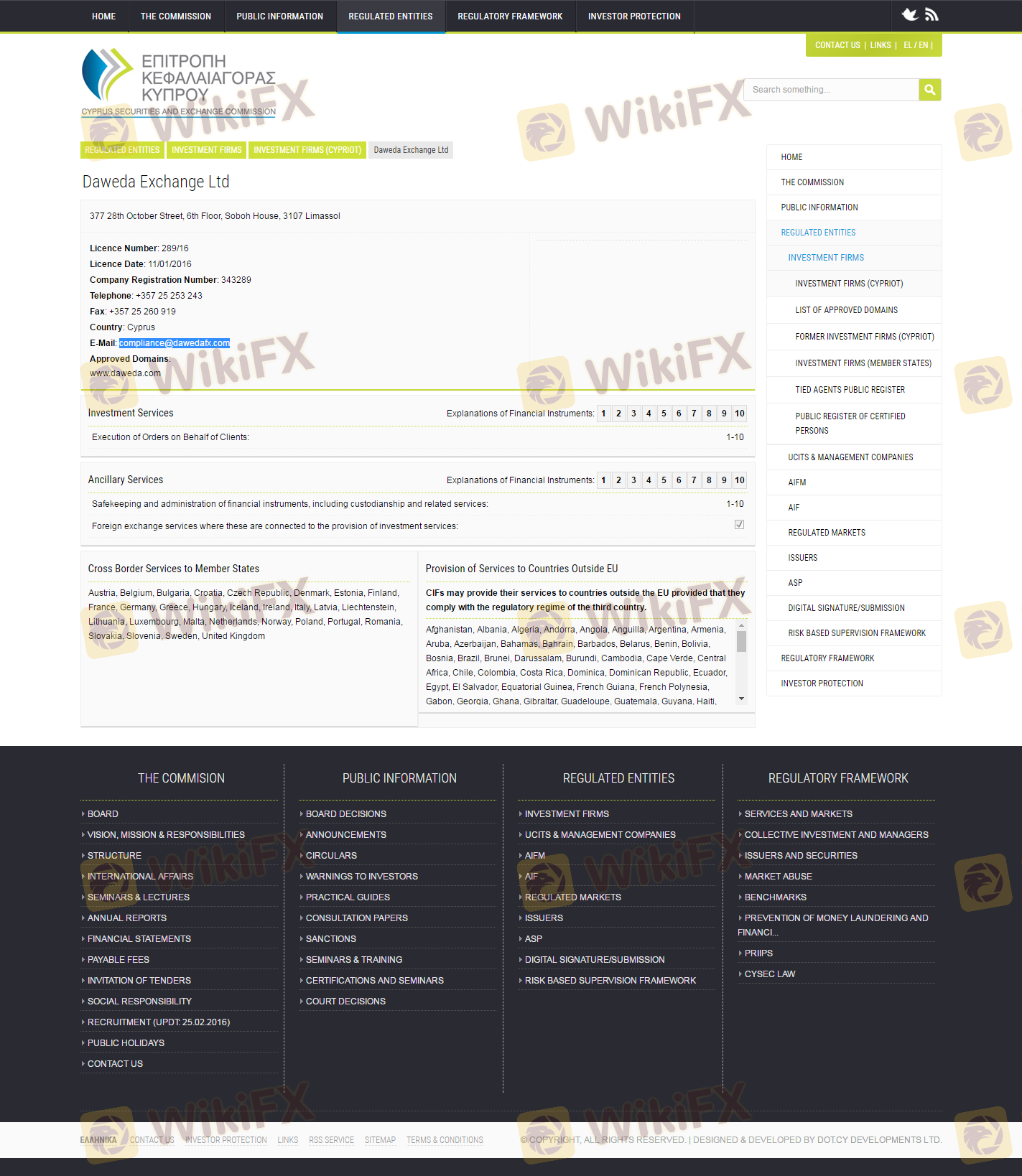 Daweda Exchange beroperasi di bawah regulasi Cyprus Securities and Exchange Commission (CySEC), yang merupakan faktor kunci dalam menilai legitimasinya. Regulasi memastikan bahwa broker mematuhi persyaratan keuangan yang ketat dan standar operasional yang dirancang untuk melindungi para trader. Berikut adalah ringkasan informasi regulasi Daweda: