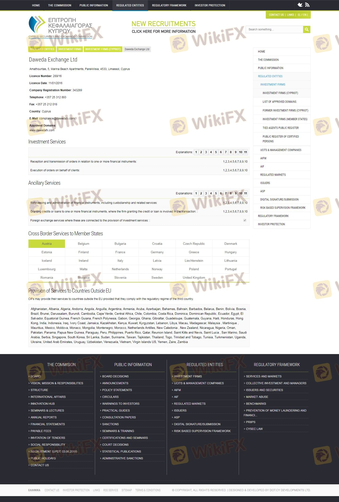 Mengenai legitimasi broker forex Daweda, ia menyediakan Siprus CYSEC, dan (Kami juga melakukan investigasi lapangan terkait aspek keamanan.).