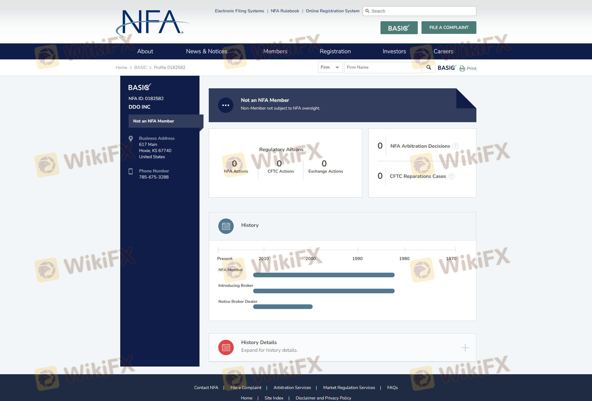 Status regulasi sebuah broker forex adalah indikator utama legitimasi dan kepercayaannya. Regulasi berfungsi sebagai langkah perlindungan bagi trader, memastikan bahwa broker mematuhi standar dan praktik tertentu. Dalam kasus ddo.inc, mereka mengklaim sebagai anggota terdaftar dari National Futures Association (NFA) AS dengan nomor registrasi 0182582. Namun, investigasi kami mengungkapkan bahwa ddo.inc bukan anggota yang disetujui oleh NFA, yang memunculkan pertanyaan serius tentang kepatuhan regulasinya.