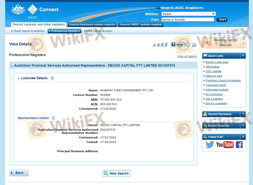 Status regulasi broker sangat penting untuk menentukan legitimasi dan keamanannya bagi trader. Decho Capital Limited mengklaim diatur oleh Australian Securities and Investments Commission (ASIC) di bawah lisensi perwakilan yang ditunjuk. Namun, beberapa sumber menunjukkan bahwa status lisensinya dicabut, yang menimbulkan kekhawatiran tentang kepatuhan regulasinya.