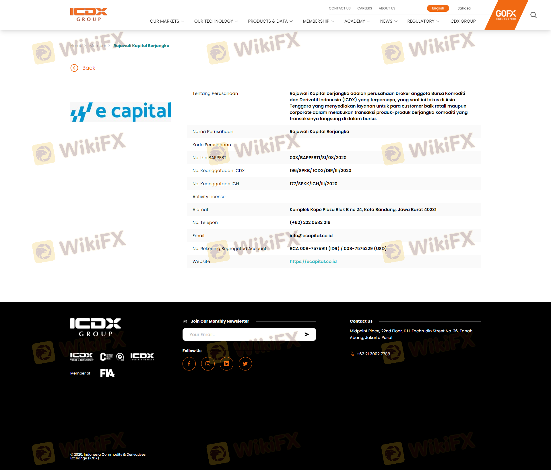 Memahami perusahaan di balik platform perdagangan sangat penting untuk menilai keandalannya. e Capital, juga dikenal sebagai PT Rajawali Kapital Berjangka, telah beroperasi selama kurang lebih 2-5 tahun. Perusahaan ini berkantor pusat di Indonesia dan berfokus pada penyediaan layanan perdagangan forex dan komoditas untuk klien ritel dan korporasi.