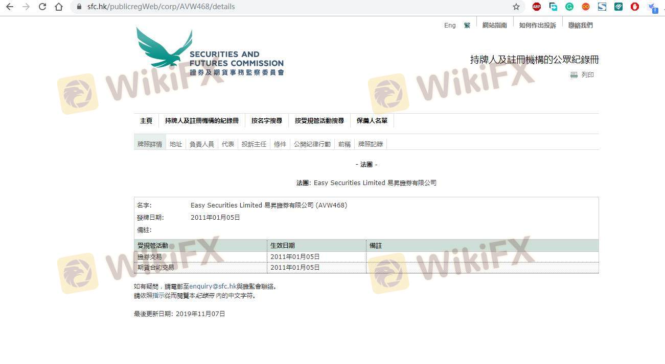 Mengenai legitimasi broker forex EASY SECURITIES, ia menyediakan Hong Kong SFC, dan (Kami juga melakukan investigasi lapangan terkait aspek keamanan.).