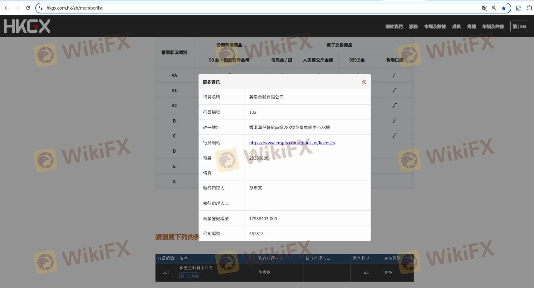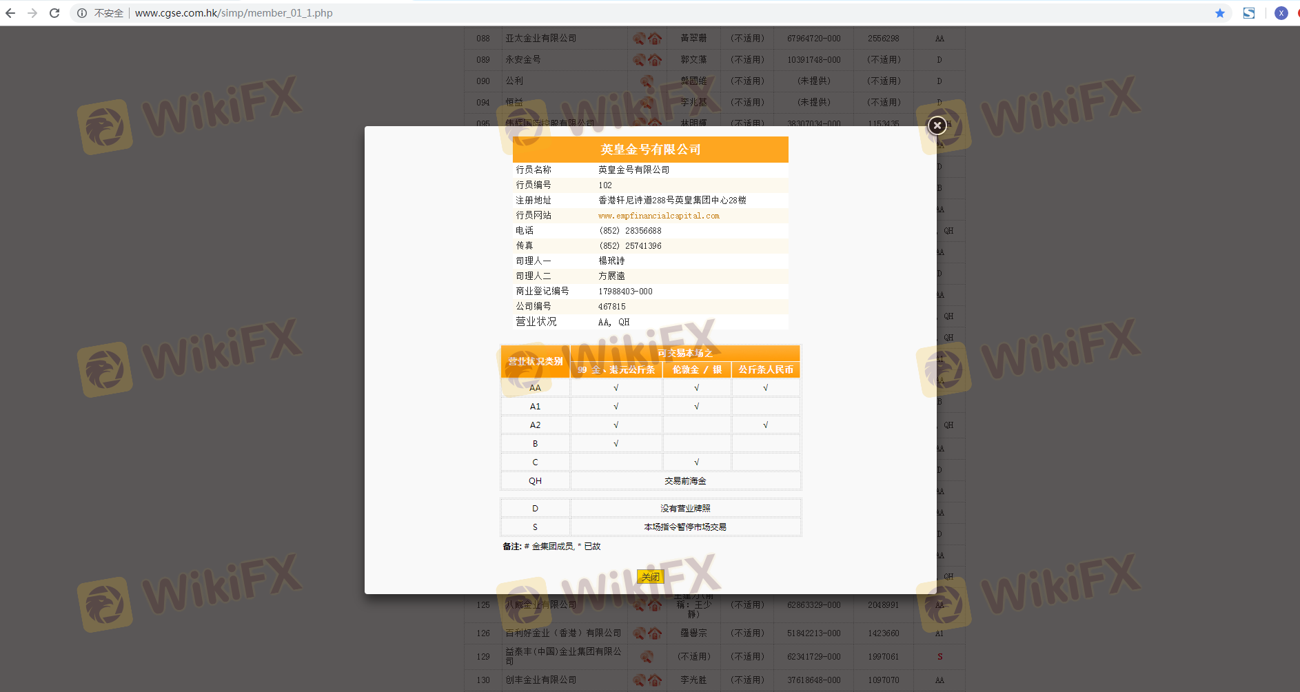 Status regulasi sebuah broker adalah salah satu indikator terpenting legitimasi dan keamanannya. Broker yang diatur dengan baik biasanya diawasi ketat, yang membantu melindungi dana trader dan memastikan praktik trading yang adil. Dalam kasus Emperor Xpro, broker ini mengklaim diatur oleh Chinese Gold & Silver Exchange Society (CGSE) dan Securities and Futures Commission (SFC) Hong Kong. Namun, kedua lembaga regulasi telah menandai Emperor Xpro sebagai "klon mencurigakan", menimbulkan kekhawatiran serius tentang legitimasinya.