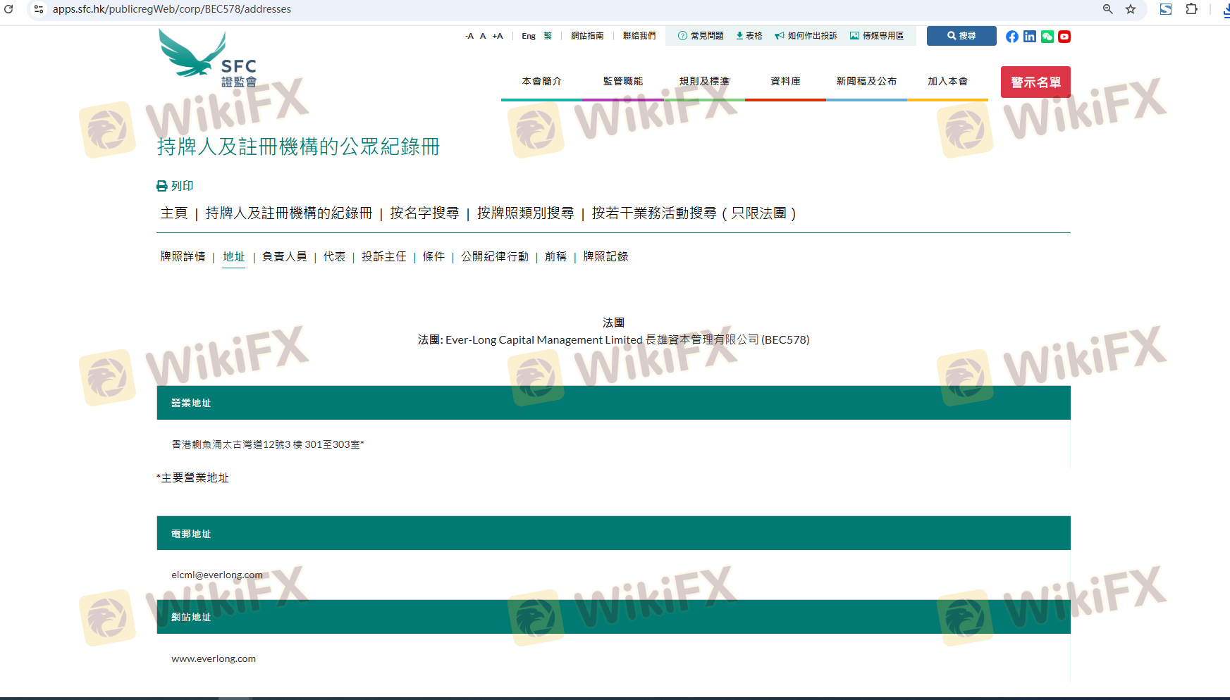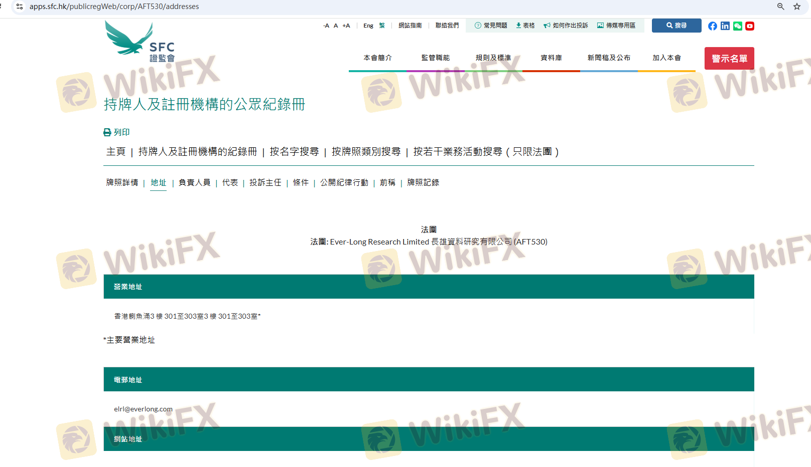 Mengenai legitimasi broker forex Ever-long, ia menyediakan Hong Kong SFC, Hong Kong SFC, Hong Kong SFC, Hong Kong SFC, dan (Kami juga melakukan investigasi lapangan terkait aspek keamanan.).