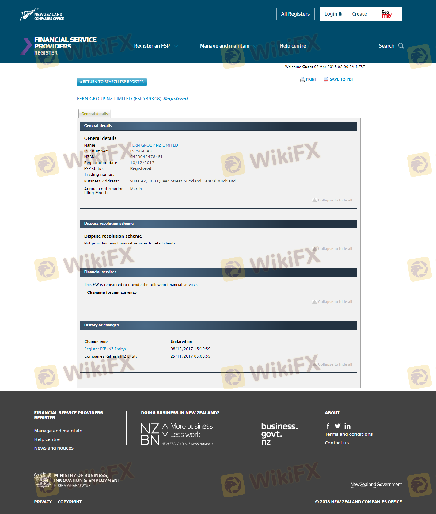 Mengenai legitimasi broker forex FERNFX, ia menyediakan Selandia Baru FSPR, dan (Kami juga melakukan investigasi lapangan terkait aspek keamanan.).