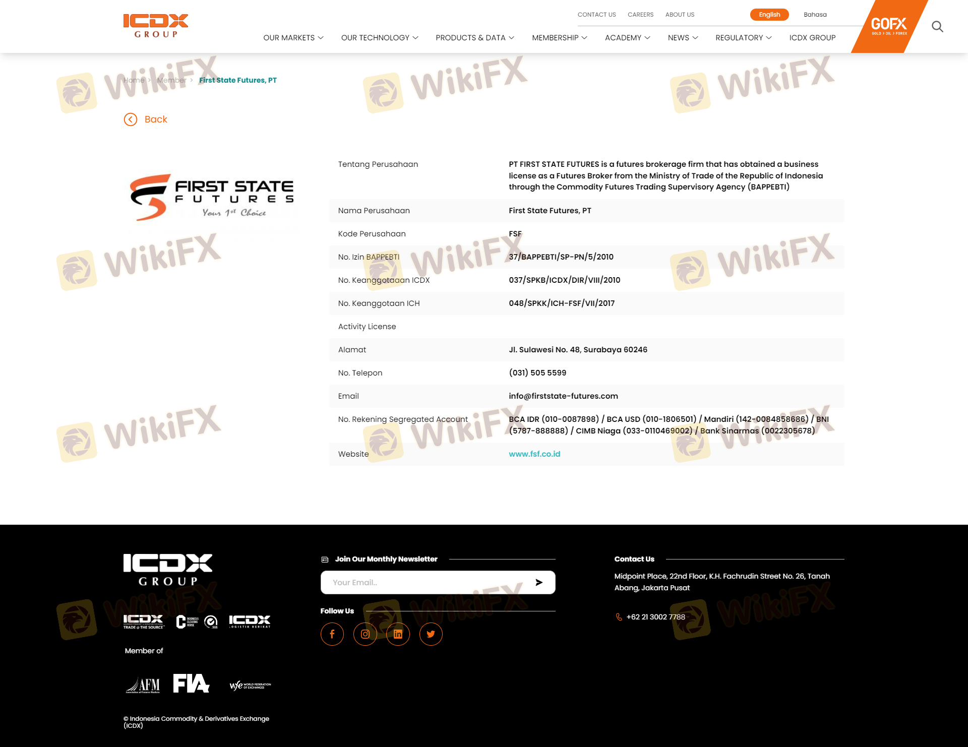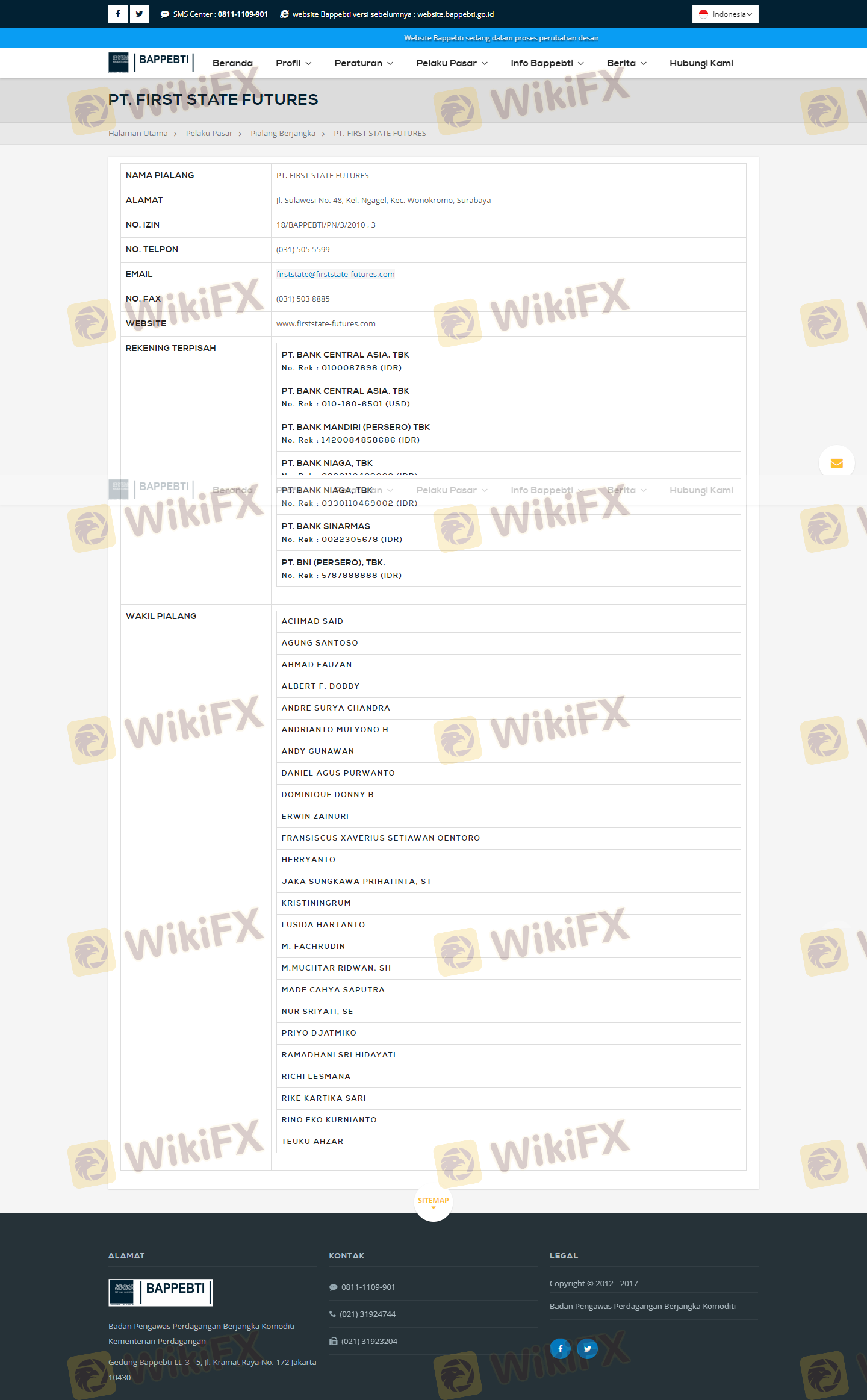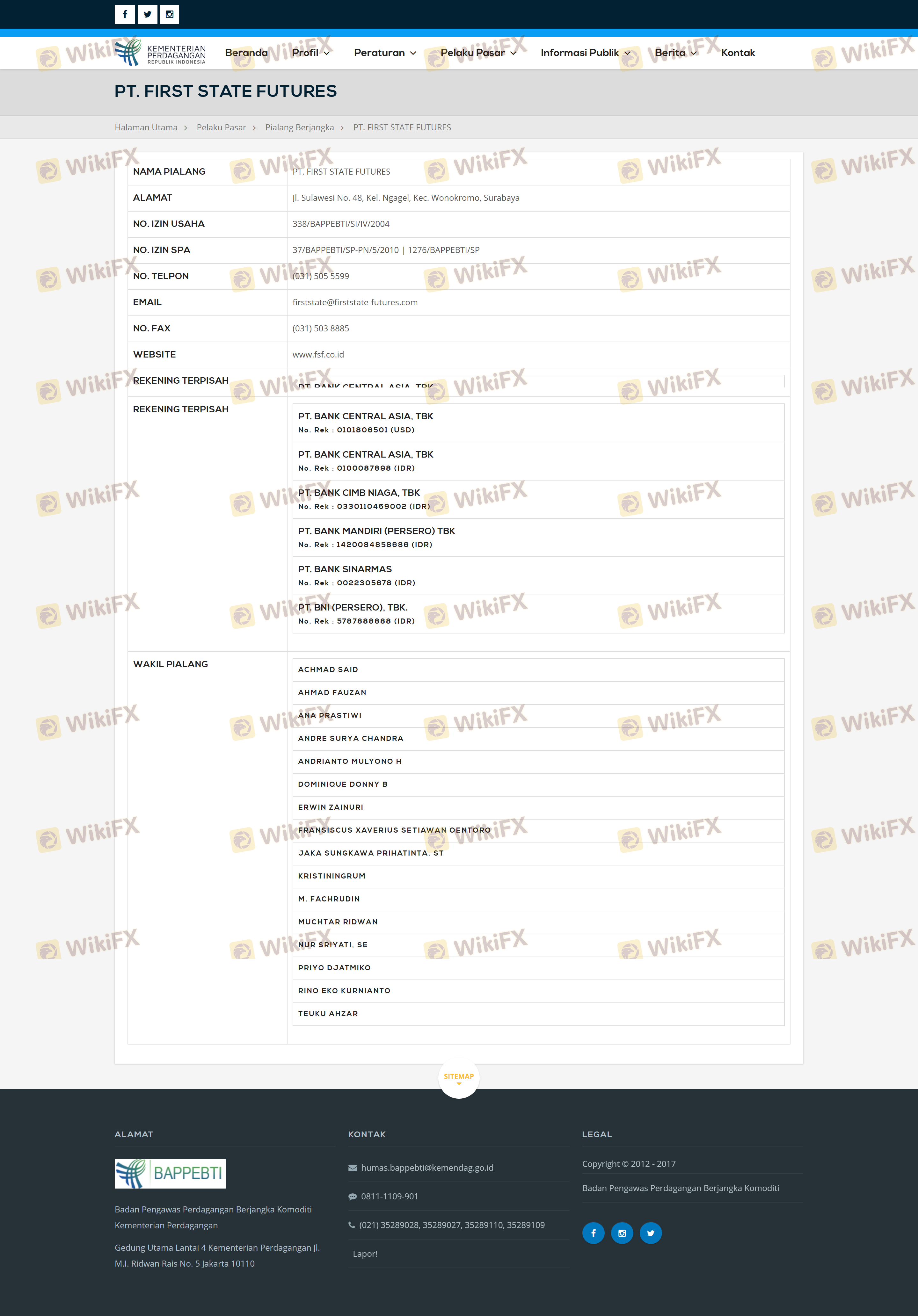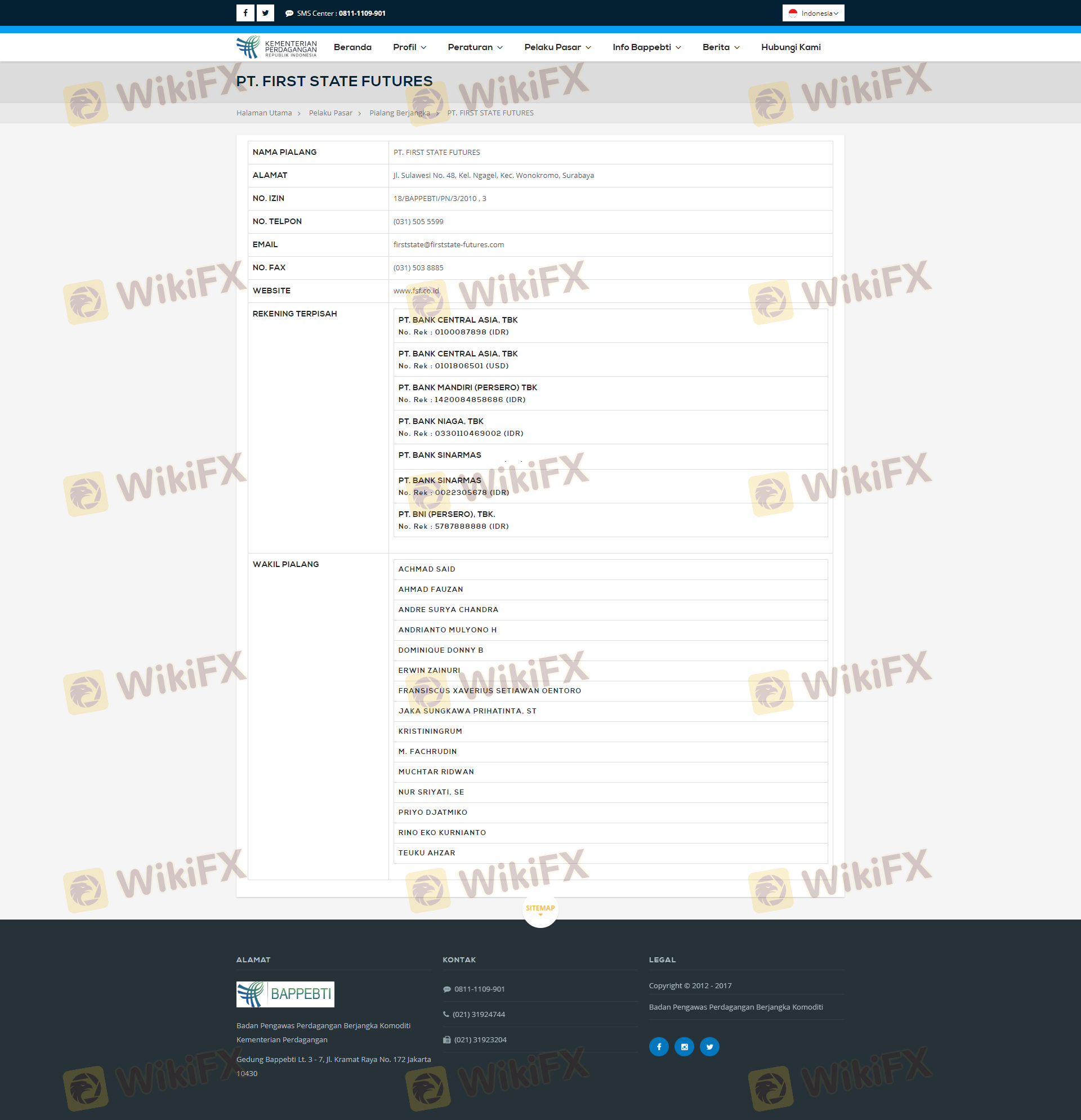 Mengenai legitimasi broker forex FIRST STATE FUTURES, ia menyediakan Indonesia BAPPEBTI, Indonesia ICDX, Indonesia JFX, dan .