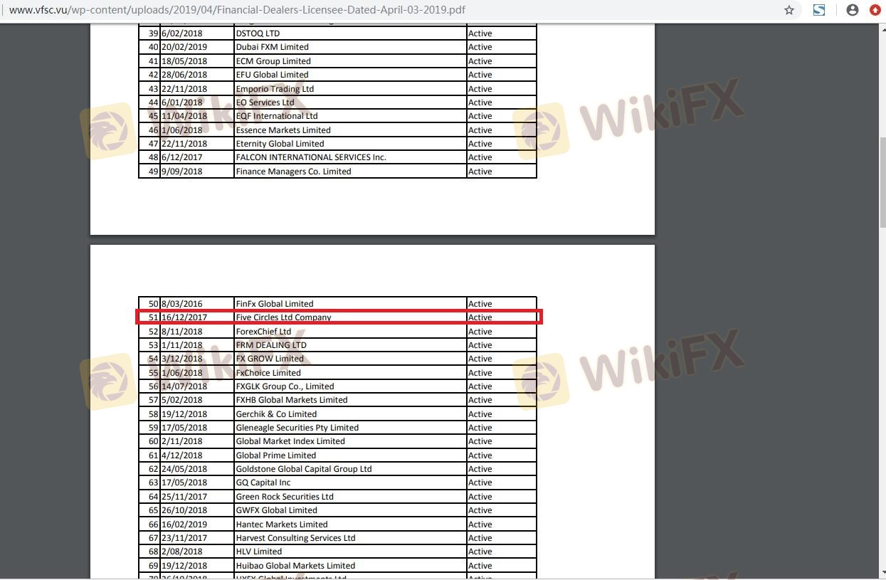 Status regulasi broker adalah faktor kritis dalam menentukan legitimasinya. Regulasi berfungsi sebagai perlindungan bagi trader, memastikan bahwa broker mematuhi standar dan praktik tertentu. Dalam kasus FiveCircles, broker ini terdaftar di Vanuatu, yurisdiksi yang dikenal dengan lingkungan regulasi yang longgar.