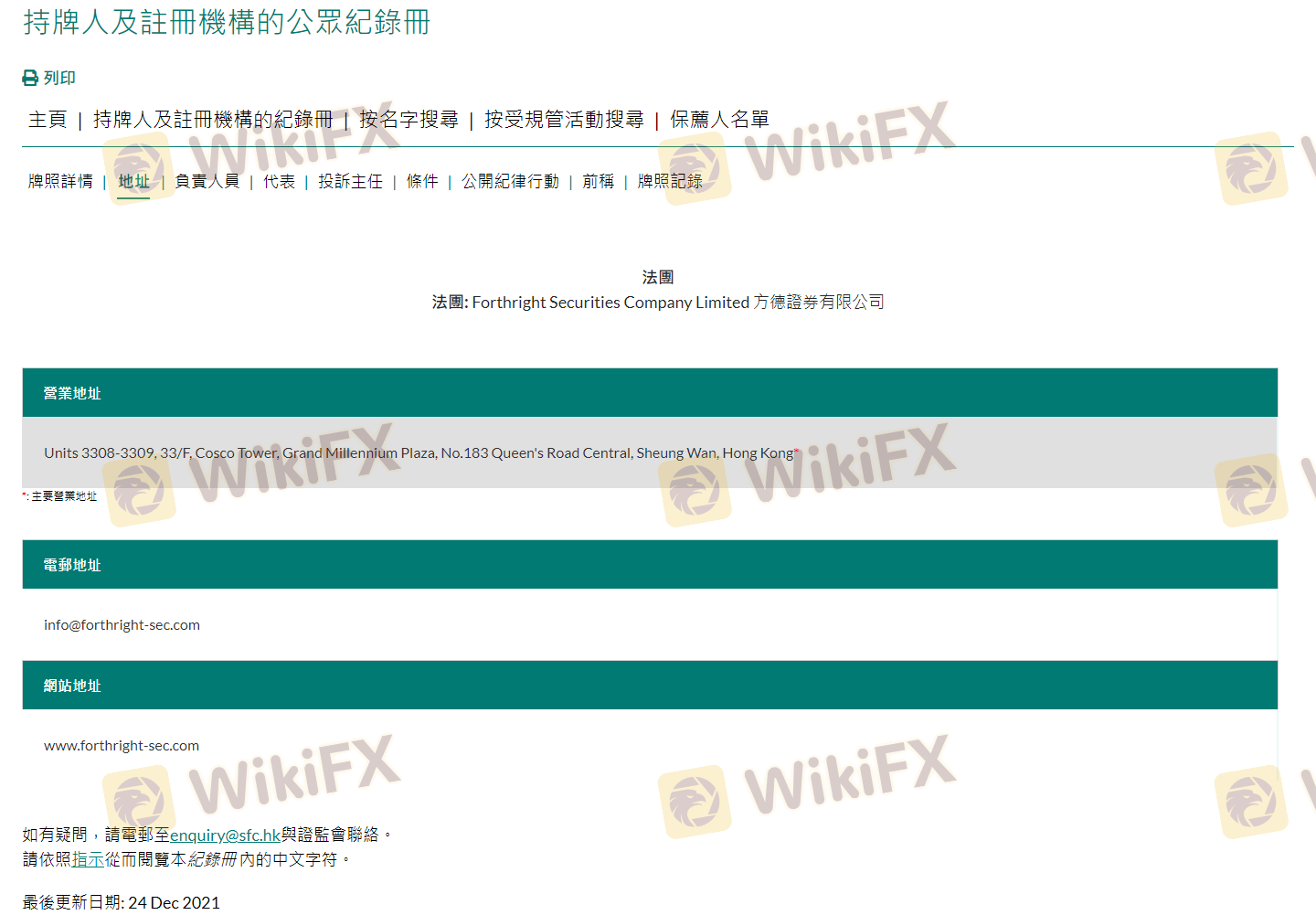 Lingkungan regulasi di mana sebuah broker beroperasi adalah faktor penting dalam menentukan keabsahannya. Forthright mengklaim diatur oleh Securities and Futures Commission (SFC) Hong Kong, yang merupakan badan regulasi terkemuka yang dikenal karena menerapkan standar kepatuhan yang ketat. Pengawasan regulasi ini sangat penting karena memberikan tingkat perlindungan bagi trader, memastikan bahwa broker mematuhi pedoman operasional tertentu.