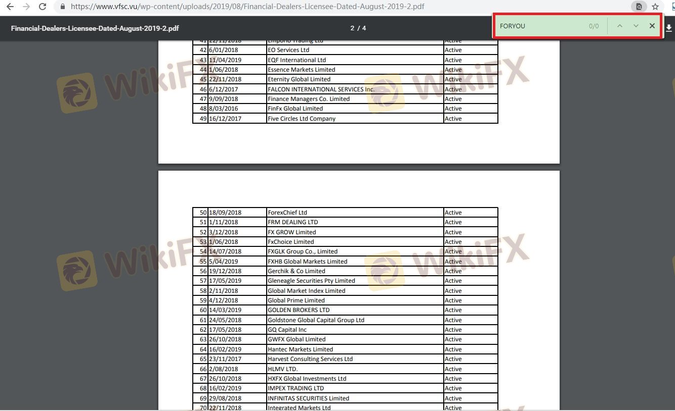 Mengenai legitimasi broker forex FORYOU, ia menyediakan Vanuatu VFSC, dan .