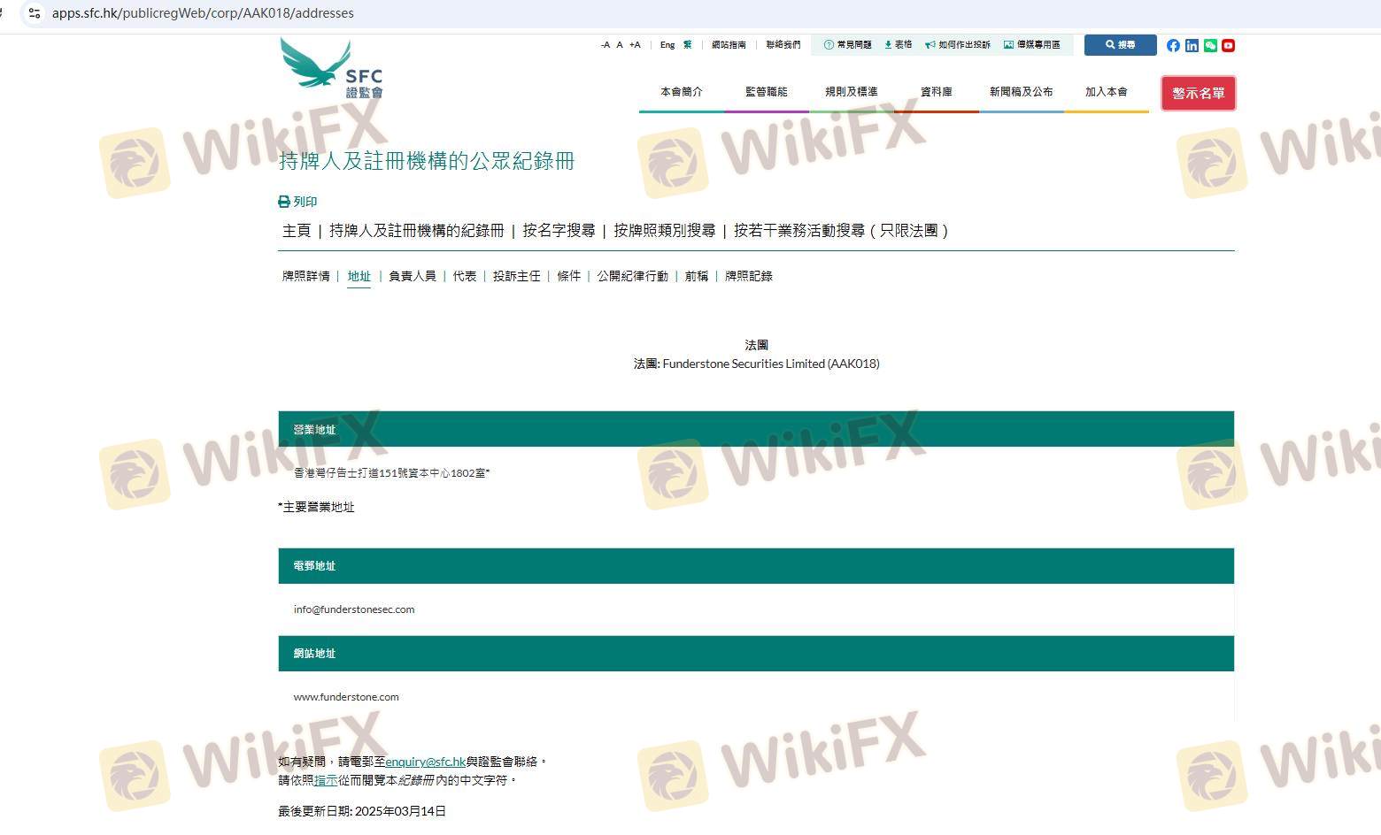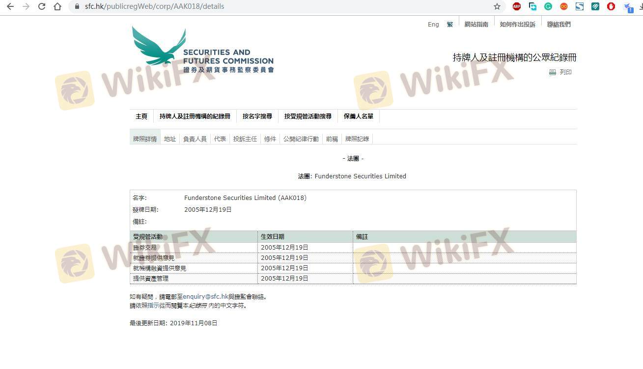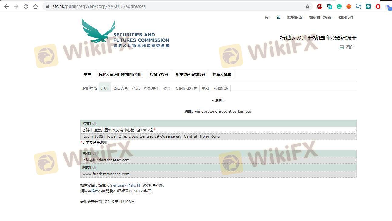 Mengenai legitimasi broker forex FUNDERSTONE, ia menyediakan Hong Kong SFC, Hong Kong SFC, dan (Kami juga melakukan investigasi lapangan terkait aspek keamanan.).