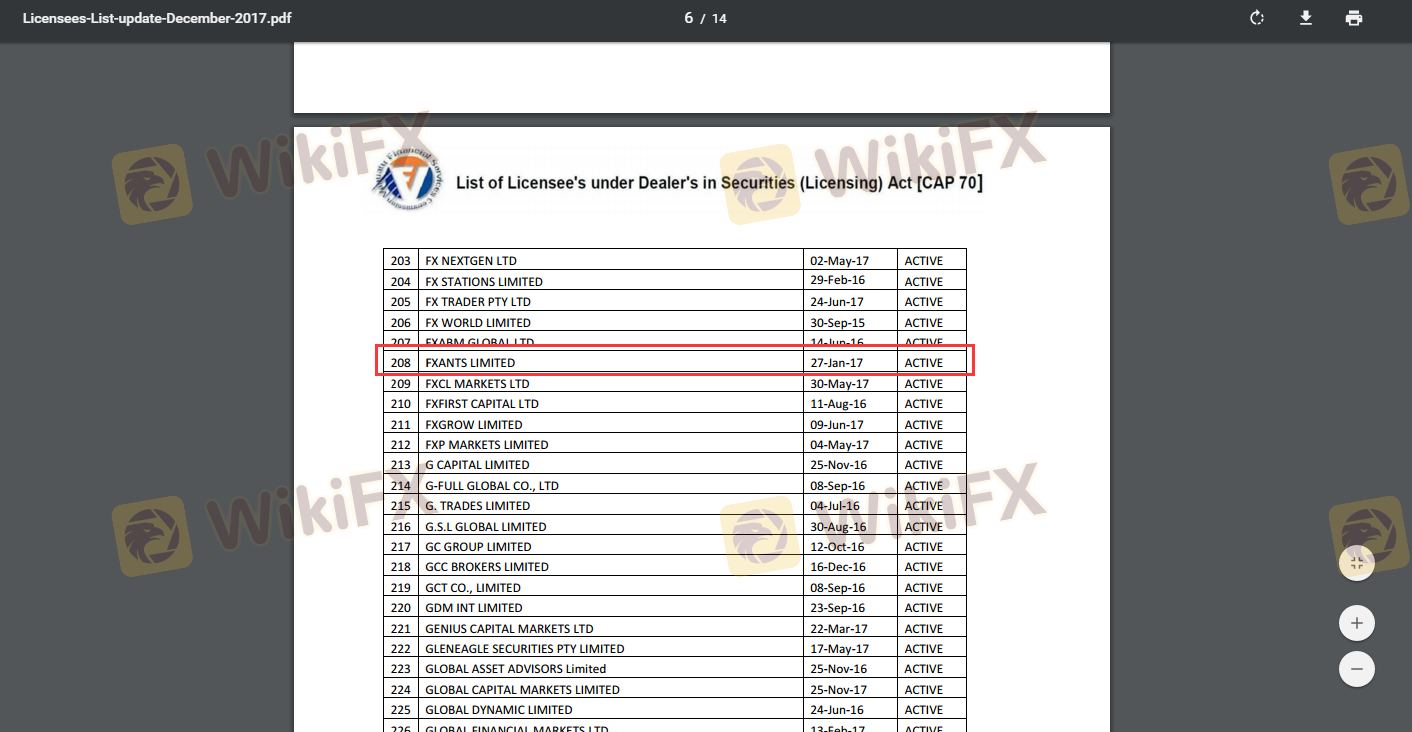 Pengawasan regulasi adalah faktor penting dalam menentukan legitimasi setiap broker forex. FXAnts beroperasi di bawah Vanuatu Financial Services Commission (VFSC), yang telah mendapat reputasi memiliki standar regulasi yang longgar. Hal ini menimbulkan kekhawatiran tentang komitmen broker dalam melindungi kepentingan klien. Berikut adalah ringkasan informasi regulasi FXAnts: