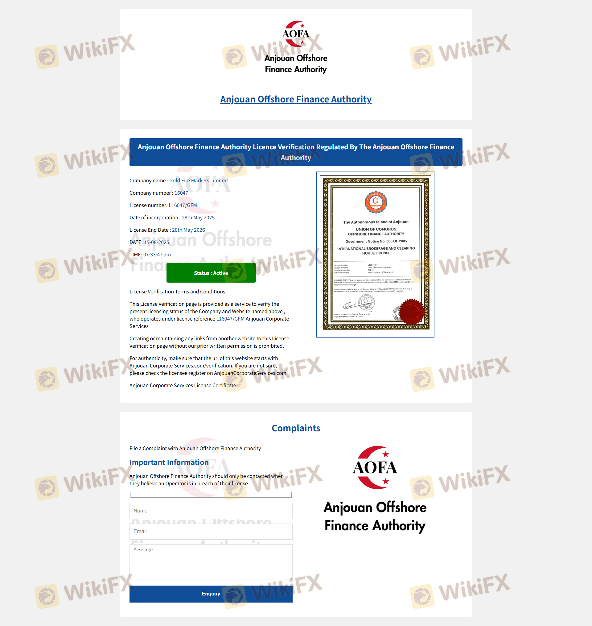 Mengenai legitimasi broker forex Gold Fire, ia menyediakan Komoro AOFA, dan (Kami juga melakukan investigasi lapangan terkait aspek keamanan.).