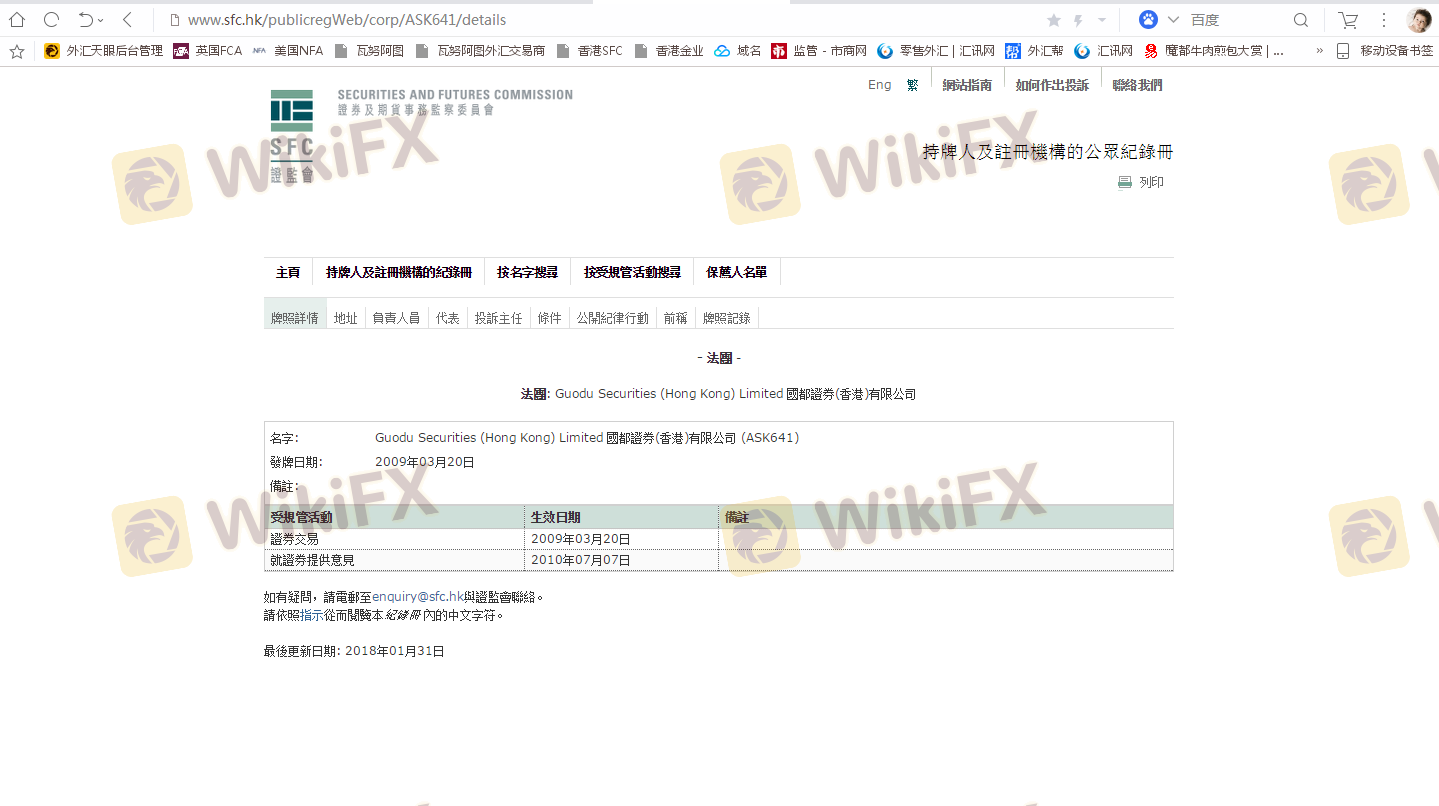 Mengenai legitimasi broker forex GUODU HONG KONG, ia menyediakan Hong Kong SFC, Hong Kong SFC, Hong Kong SFC, dan (Kami juga melakukan investigasi lapangan terkait aspek keamanan.).