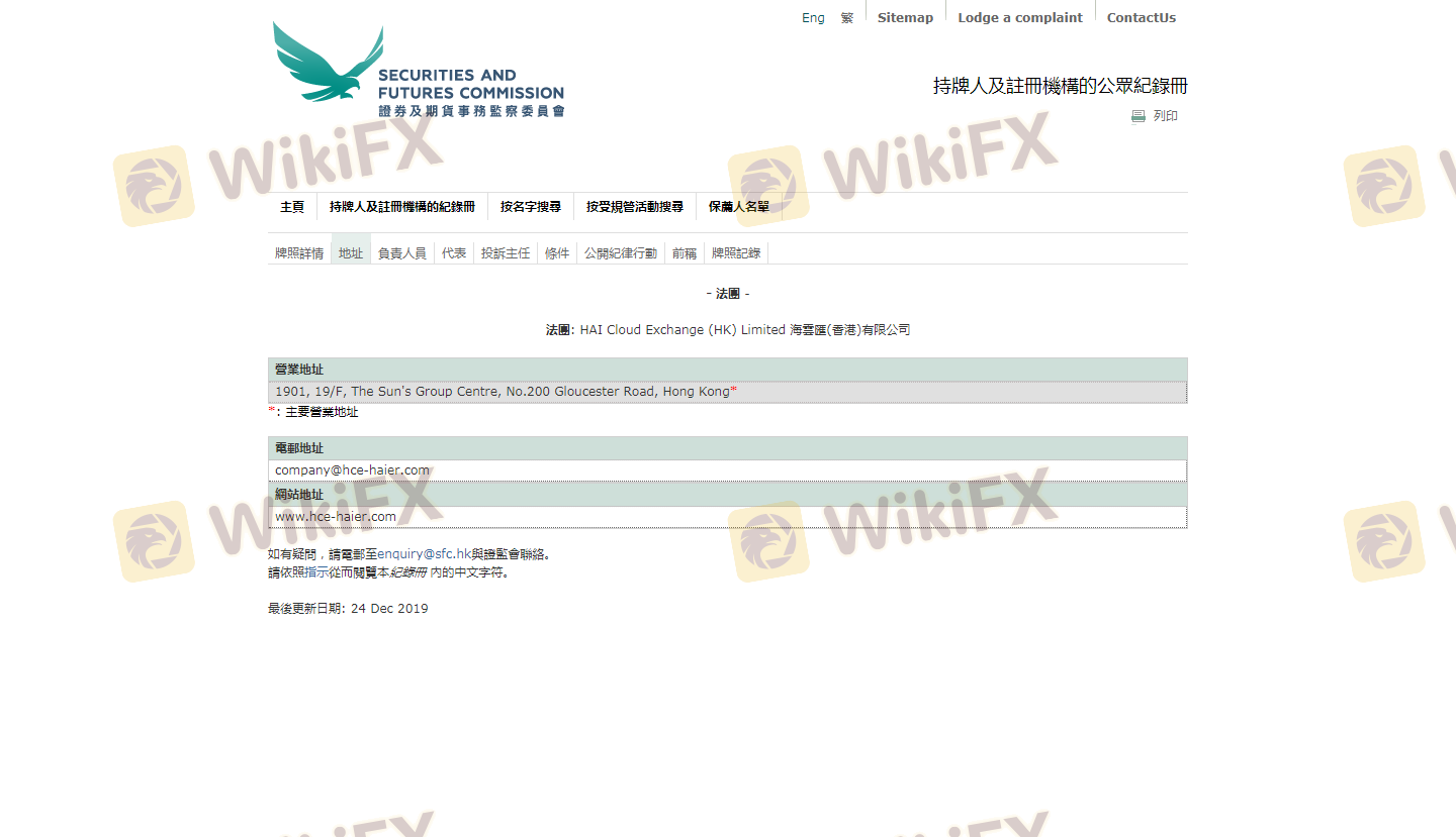 Pengawasan regulasi merupakan faktor penting dalam menentukan keamanan sebuah platform perdagangan. Hai Cloud Exchange beroperasi di bawah pengawasan Securities and Futures Commission (SFC) Hong Kong, yang dikenal dengan standar regulasinya yang ketat. Kehadiran badan regulasi tidak hanya meningkatkan kepercayaan investor tetapi juga memastikan kepatuhan terhadap persyaratan hukum.
