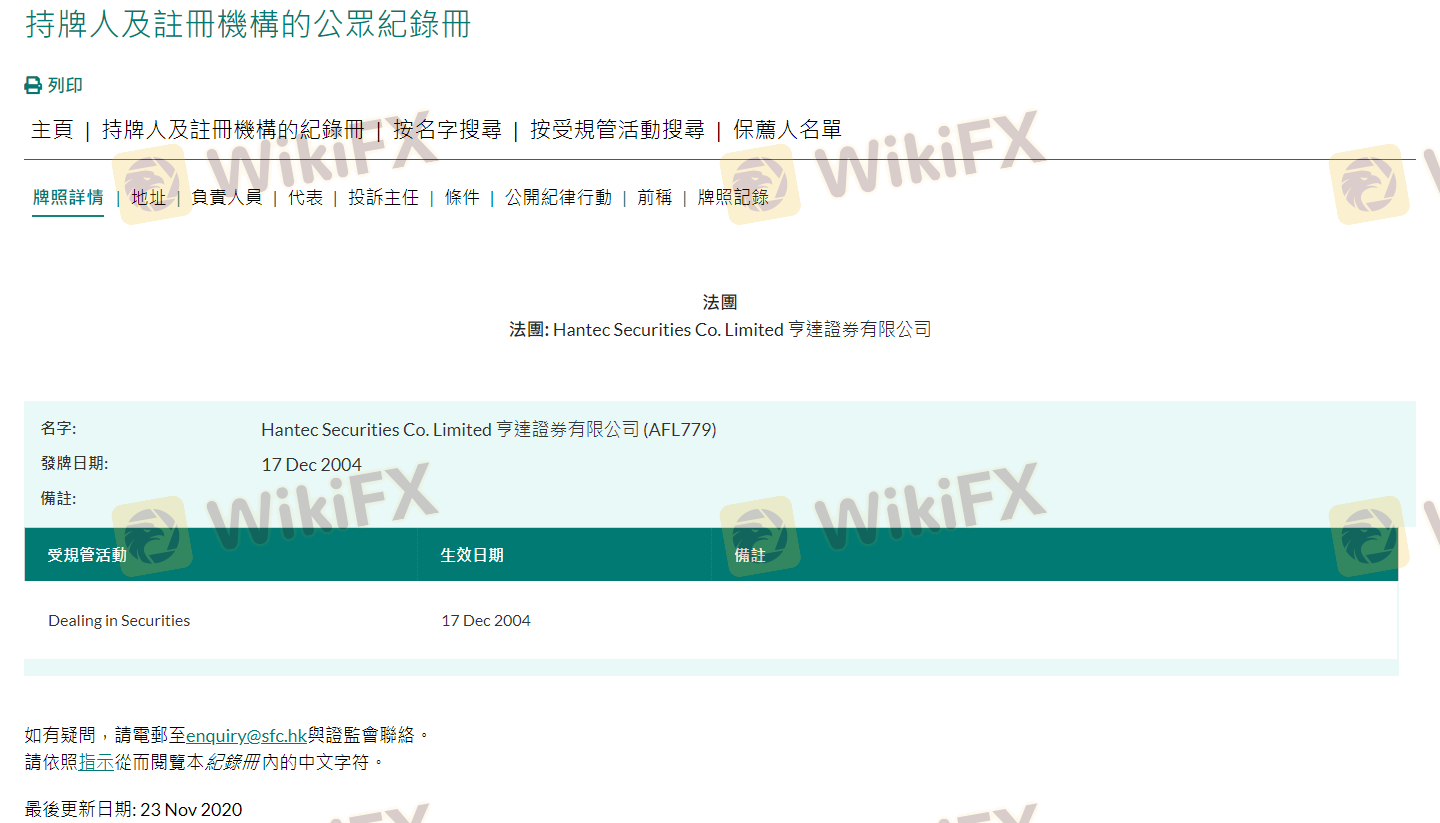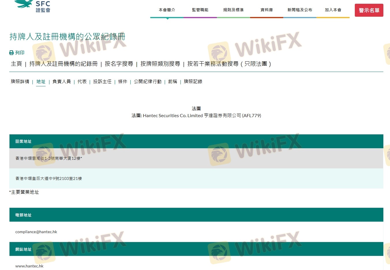 Mengenai legitimasi broker forex HANTEC, ia menyediakan Hong Kong SFC, Hong Kong SFC, dan (Kami juga melakukan investigasi lapangan terkait aspek keamanan.).