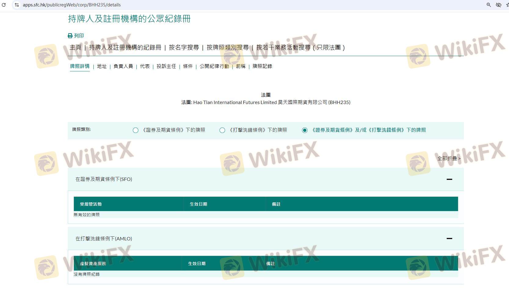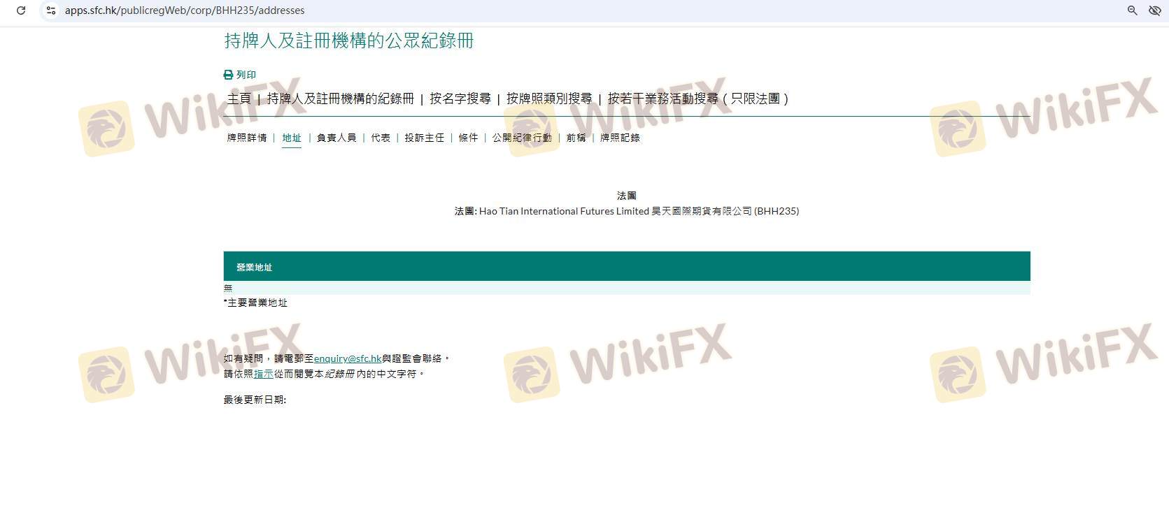 Mengenai legitimasi broker forex Hao Tian Financial, ia menyediakan Hong Kong SFC, dan (Kami juga melakukan investigasi lapangan terkait aspek keamanan.).