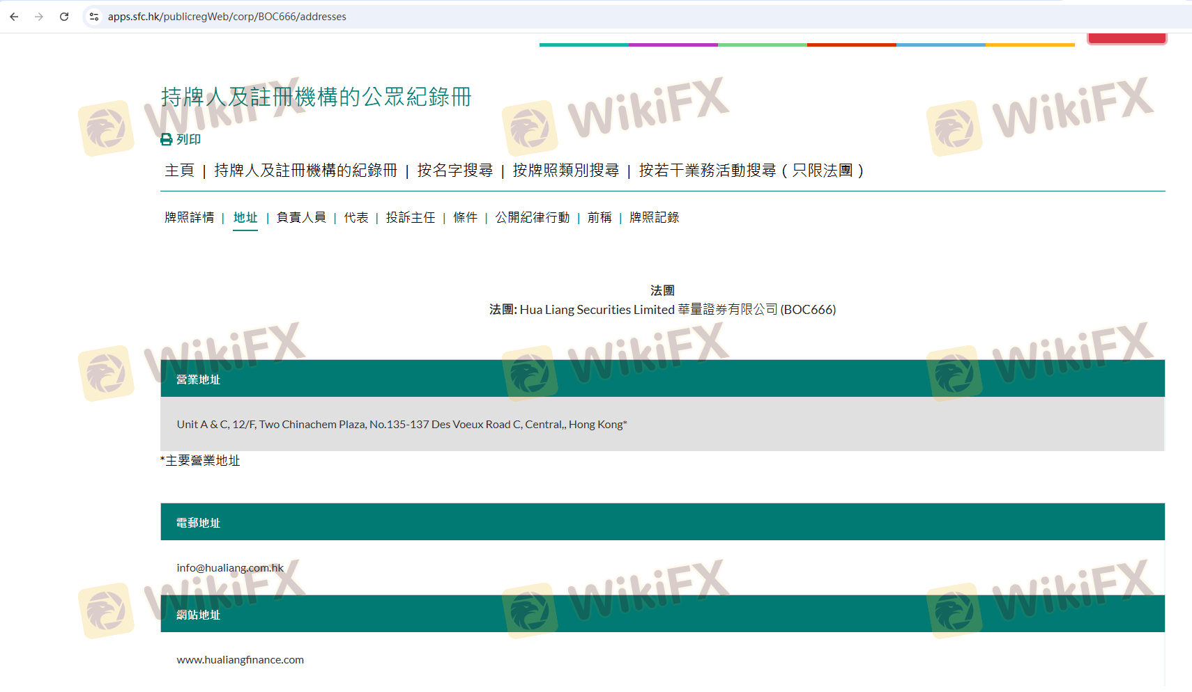 Mengenai legitimasi broker forex HUA LIANG, ia menyediakan Hong Kong SFC, dan (Kami juga melakukan investigasi lapangan terkait aspek keamanan.).
