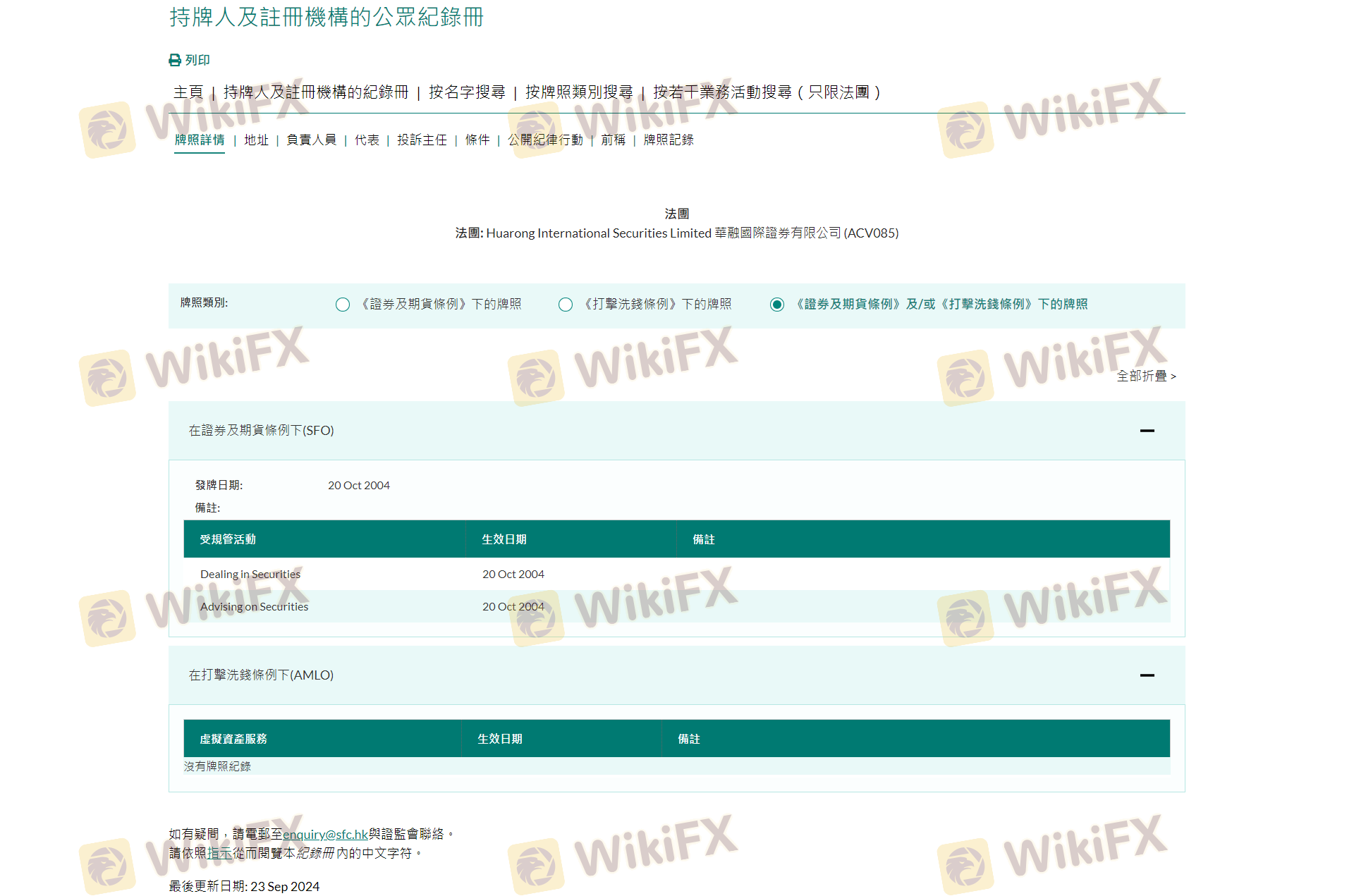 Pengawasan regulasi adalah faktor kritis dalam menilai keamanan seorang broker forex. Huarong diatur oleh Securities and Futures Commission (SFC) Hong Kong, yang dikenal dengan kerangka regulasinya yang ketat. Status regulasi ini signifikan karena ini berarti bahwa Huarong tunduk pada audit rutin dan harus mematuhi persyaratan modal yang ketat, sehingga meningkatkan legitimasinya di pasar keuangan.