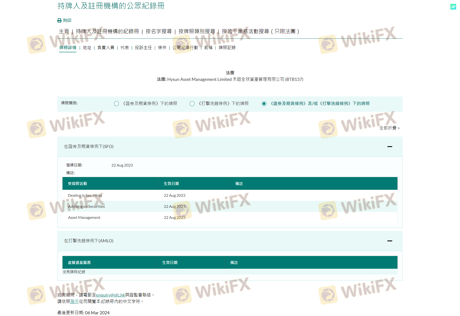 Mengenai legitimasi broker forex Hysun, ia menyediakan Hong Kong SFC, dan (Kami juga melakukan investigasi lapangan terkait aspek keamanan.).