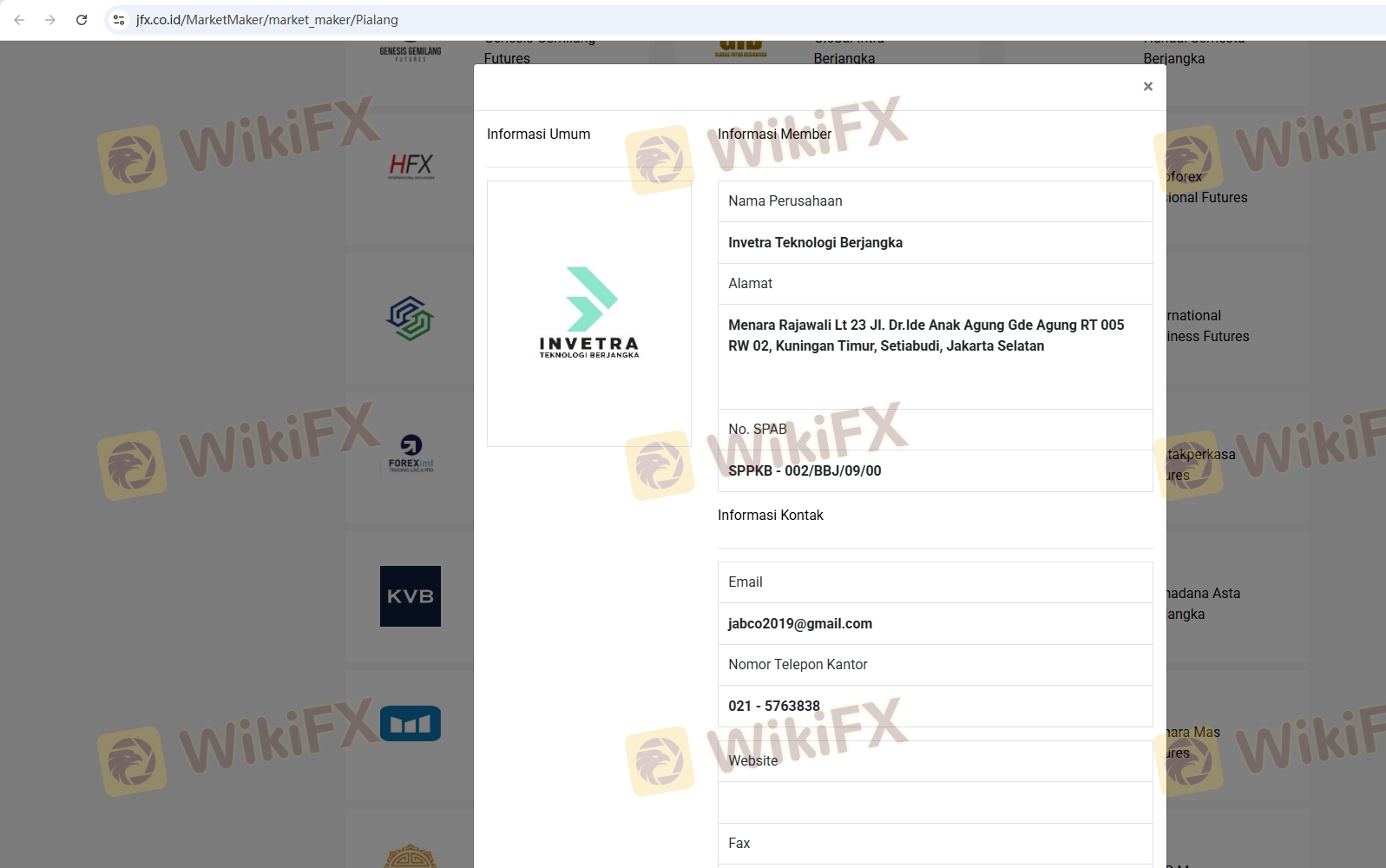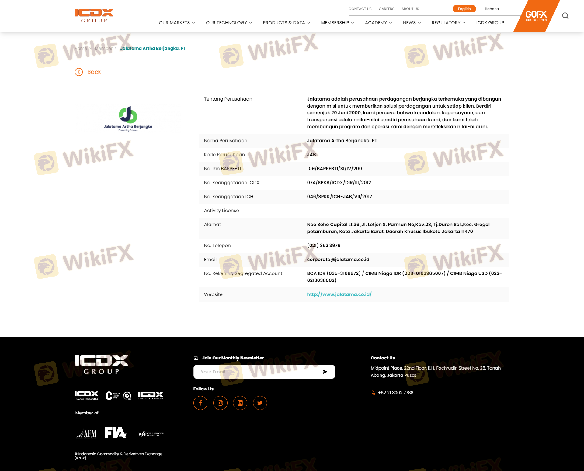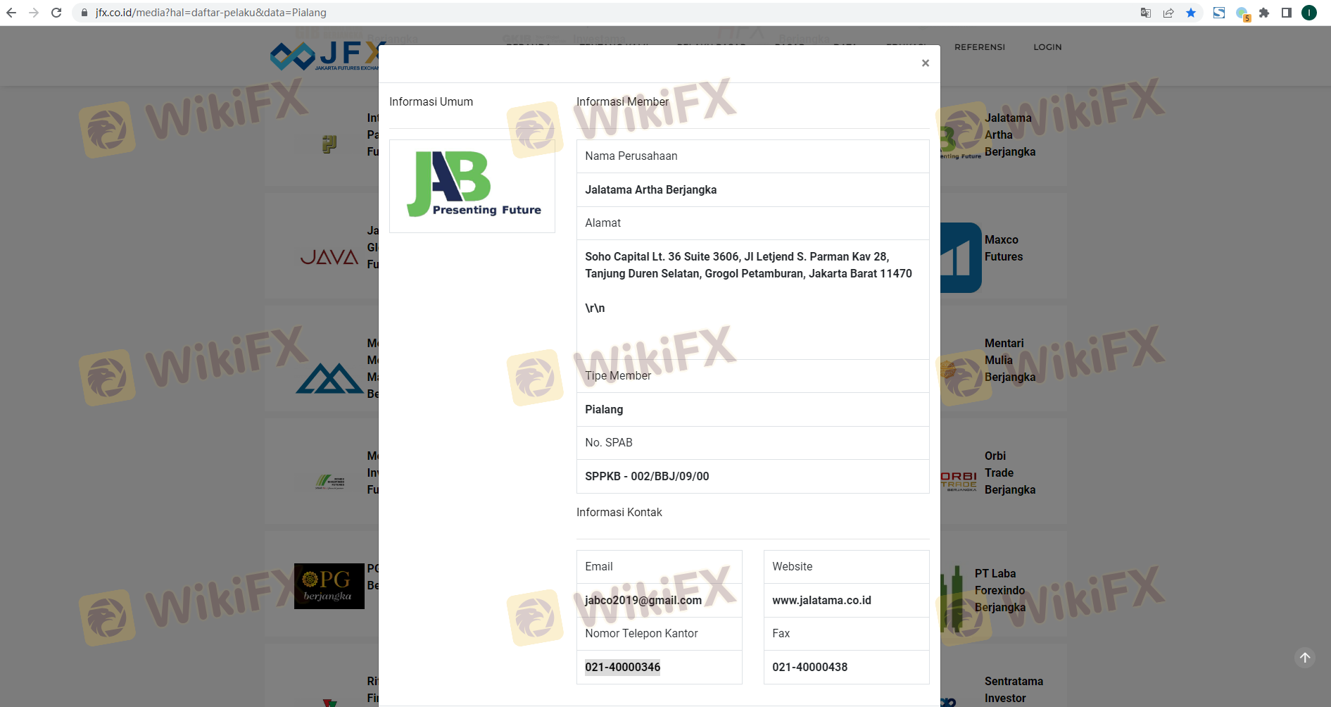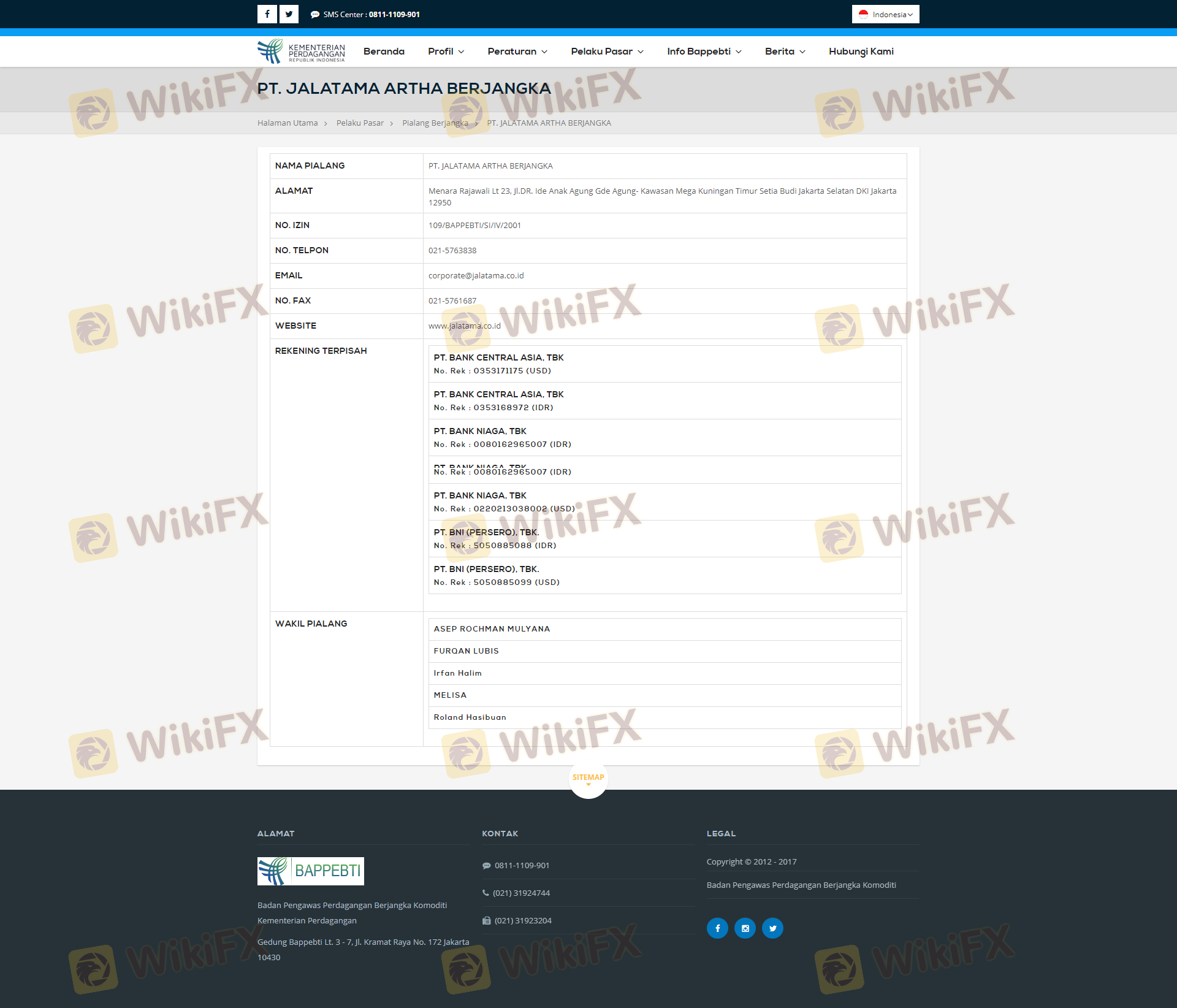Mengenai legitimasi broker forex Jalatama, ia menyediakan Indonesia ICDX, Indonesia BAPPEBTI, Indonesia JFX, Indonesia BAPPEBTI, dan (Kami juga melakukan investigasi lapangan terkait aspek keamanan.).