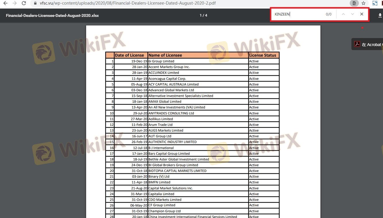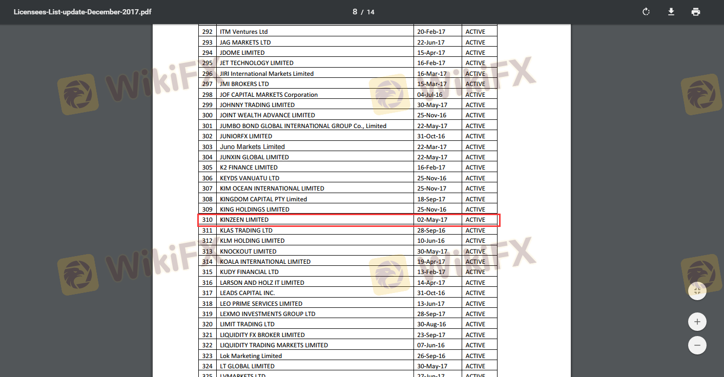 Mengenai legitimasi broker forex KINZEEN, ia menyediakan Vanuatu VFSC, dan .