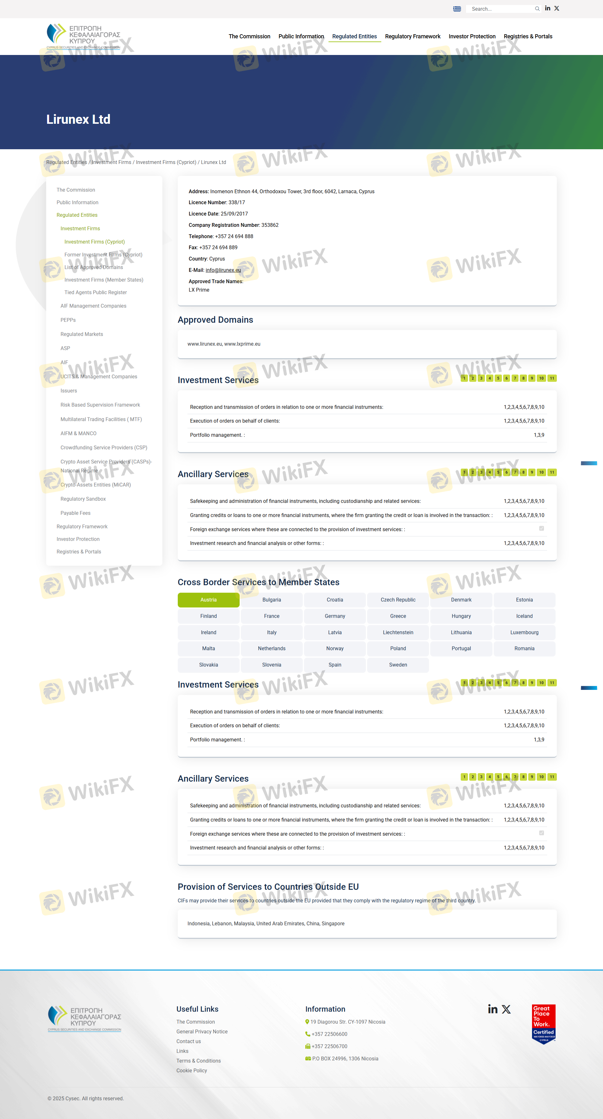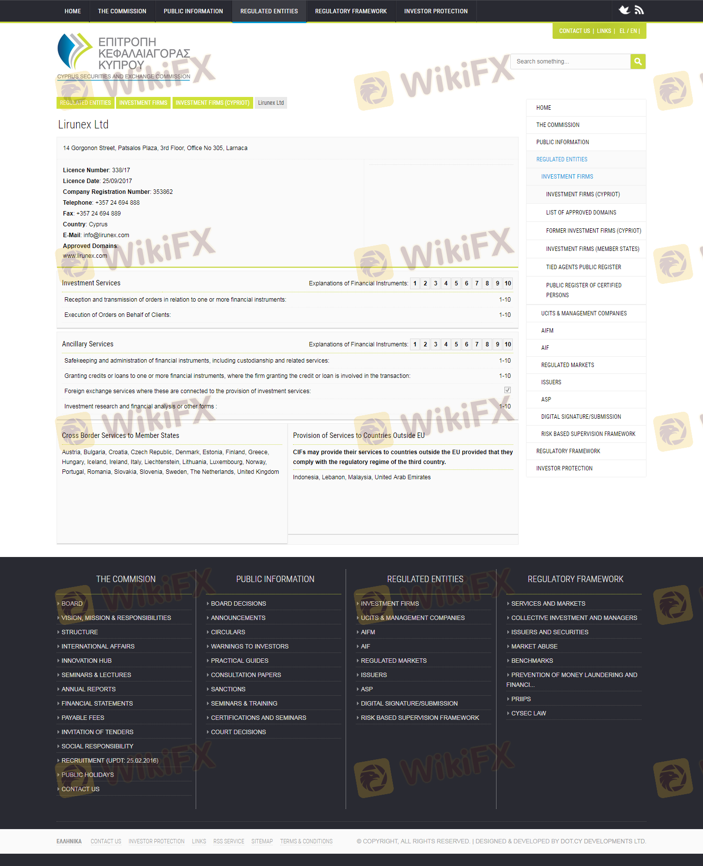 Mengenai legitimasi broker forex LIRUNEX, ia menyediakan Siprus CYSEC, Malaysia LFSA, dan (Kami juga melakukan investigasi lapangan terkait aspek keamanan.).