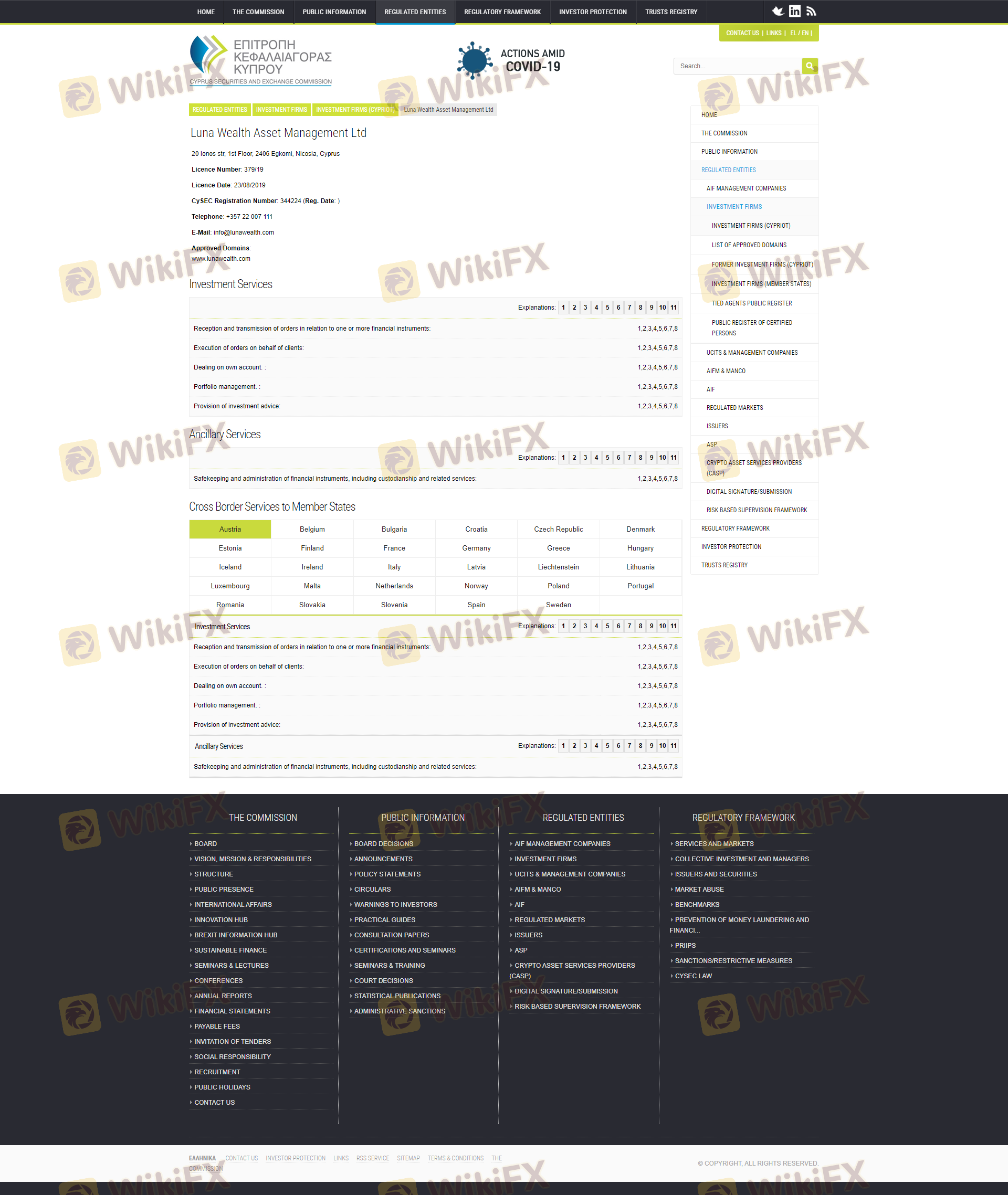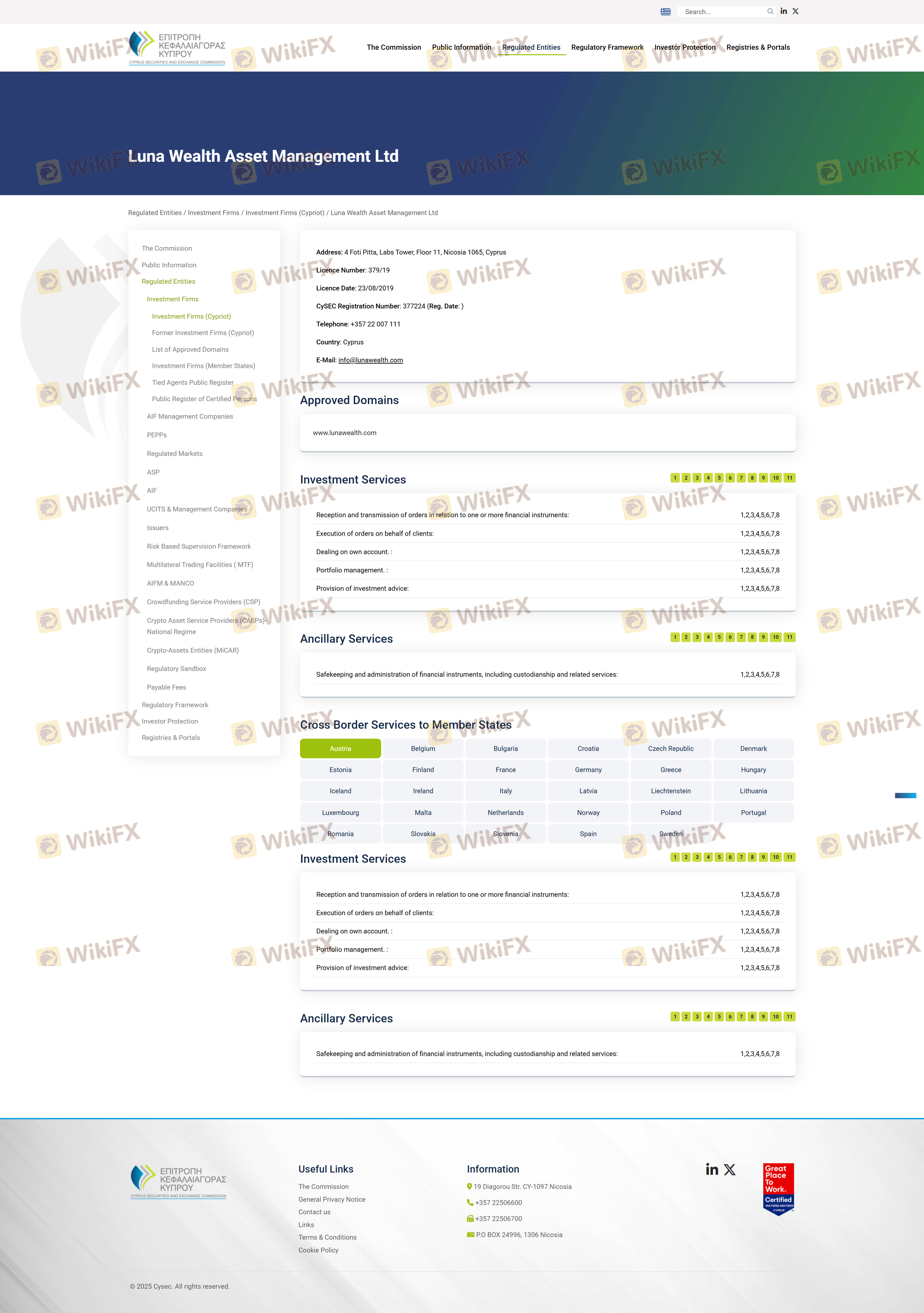 Regulasi adalah faktor kritis dalam menentukan legitimasi sebuah broker. Luna Wealth diatur oleh Cyprus Securities and Exchange Commission (CySEC), yang dikenal dengan kerangka regulasi yang kuat di dalam Uni Eropa. Berada di bawah pengawasan CySEC berarti Luna Wealth harus mematuhi standar kepatuhan yang ketat, termasuk mempertahankan cadangan modal yang memadai dan memastikan transparansi dalam operasional.