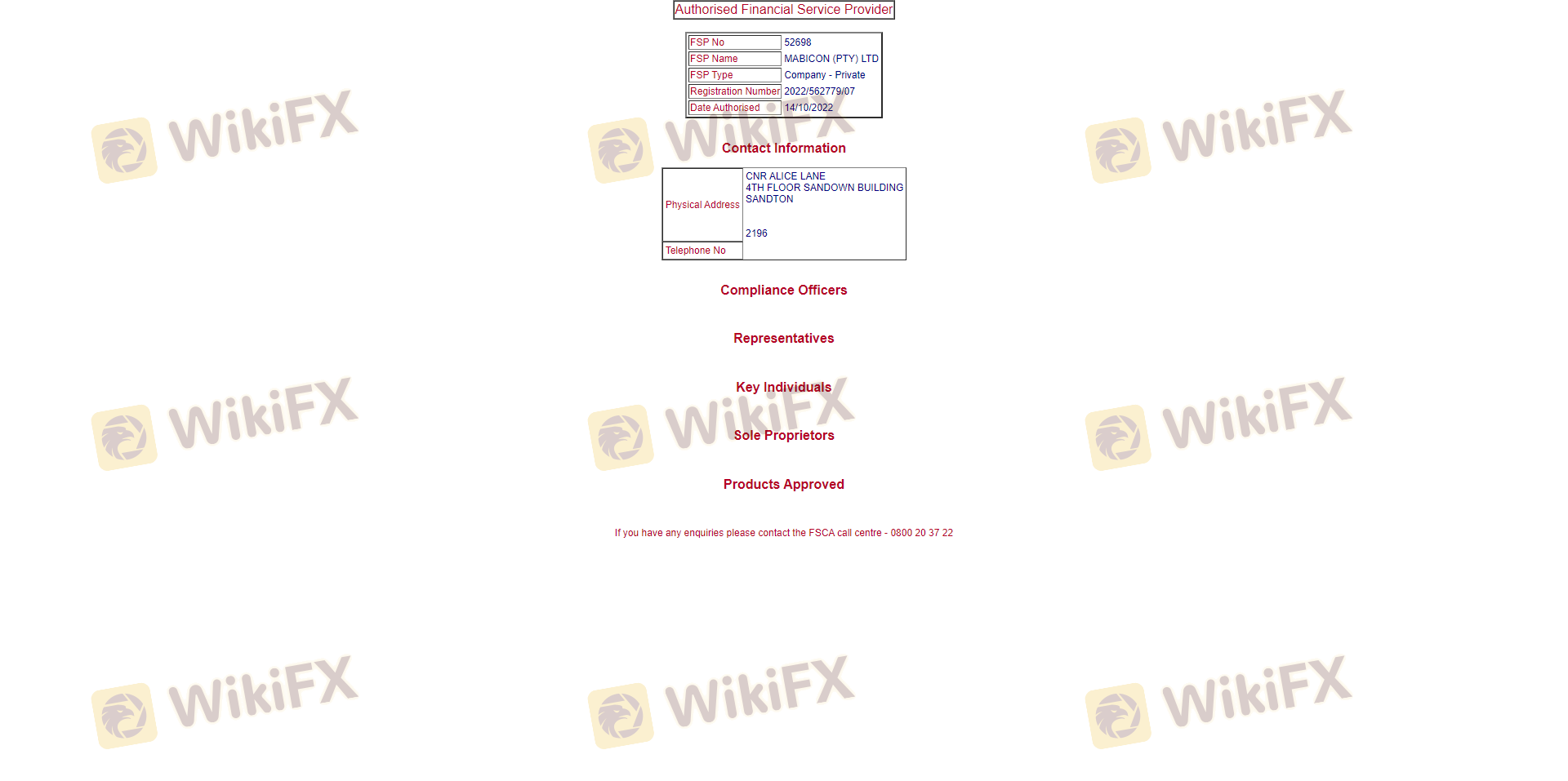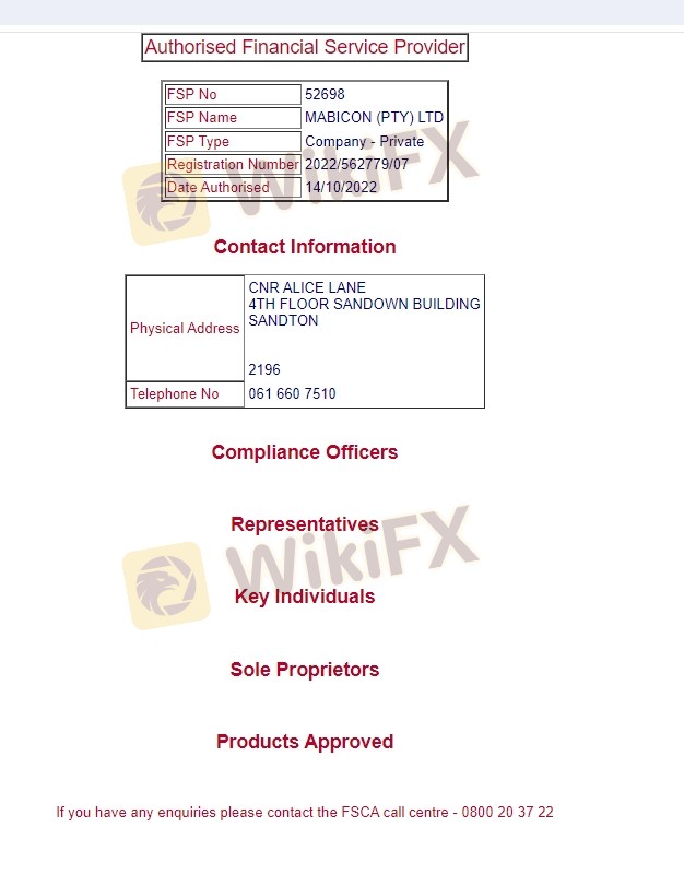 Mabicon beroperasi di bawah pengawasan Financial Sector Conduct Authority (FSCA) Afrika Selatan. Lembaga regulasi ini bertanggung jawab untuk memastikan bahwa lembaga keuangan mematuhi standar dan praktik yang ditetapkan untuk melindungi investor. Pentingnya regulasi tidak bisa diremehkan, karena memberikan jaminan bahwa broker beroperasi sesuai hukum dan mempertahankan standar perilaku tertentu.