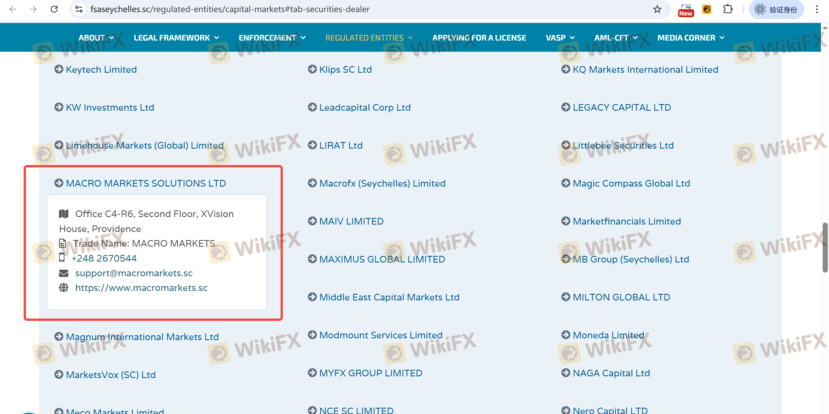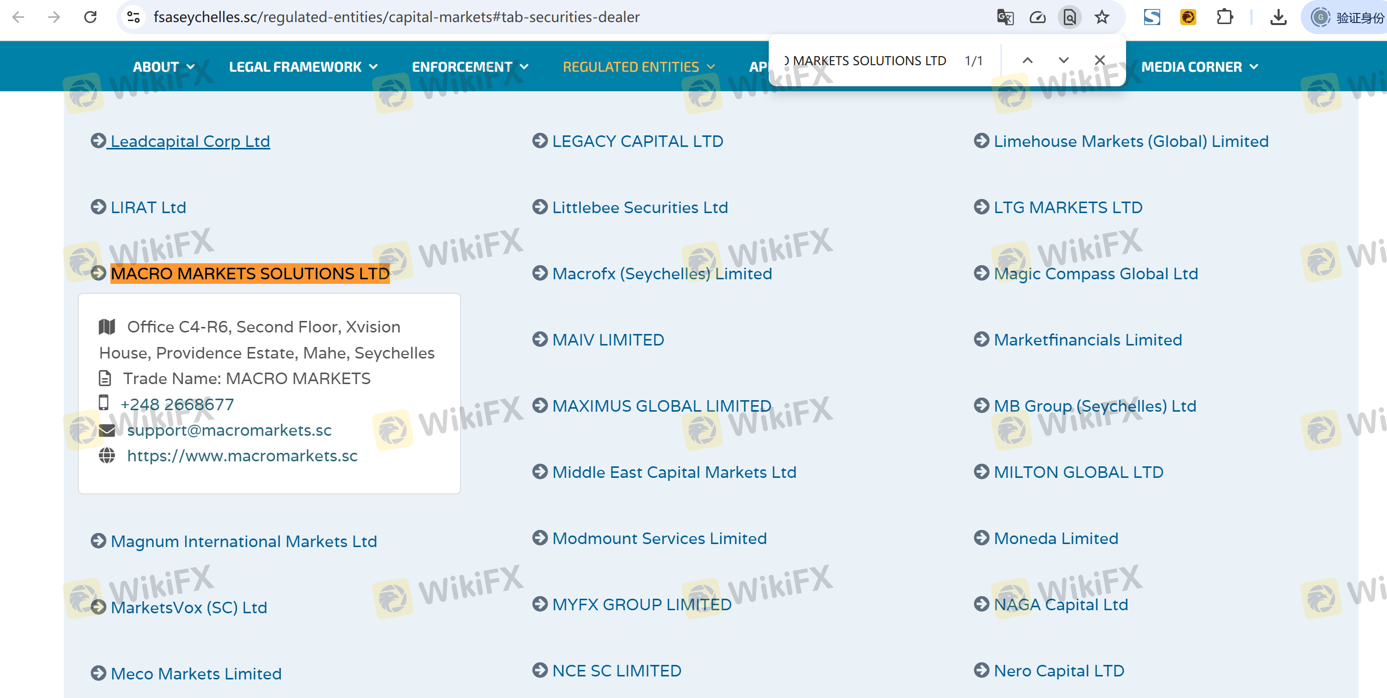 Pengawasan regulasi adalah faktor penting dalam menentukan keamanan dan keandalan broker forex. Macro Markets mengklaim diatur oleh beberapa otoritas, termasuk Australian Securities and Investments Commission (ASIC) dan Seychelles Financial Services Authority (FSA). Berikut adalah ringkasan status regulasinya: