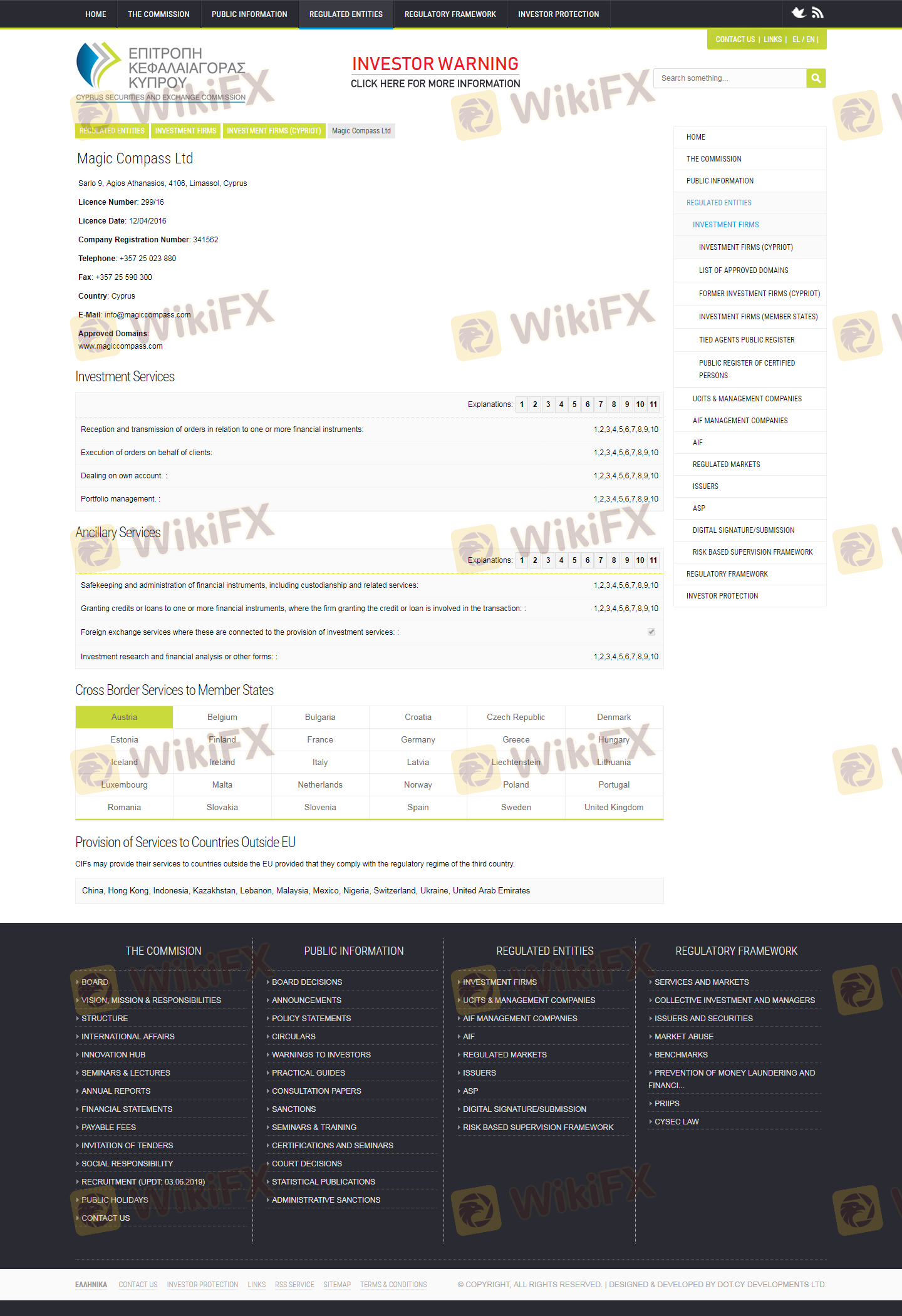 Kerangka regulasi di mana sebuah broker beroperasi adalah faktor kritis dalam menentukan legitimasi dan keamanannya bagi trader. Magic Compass diatur oleh Cyprus Securities and Exchange Commission (CySEC), yang dikenal dengan persyaratan kepatuhan yang ketat. Pengawasan regulasi ini dimaksudkan untuk melindungi investor dan memastikan praktik trading yang adil. Berikut adalah ringkasan informasi regulasi inti untuk Magic Compass: