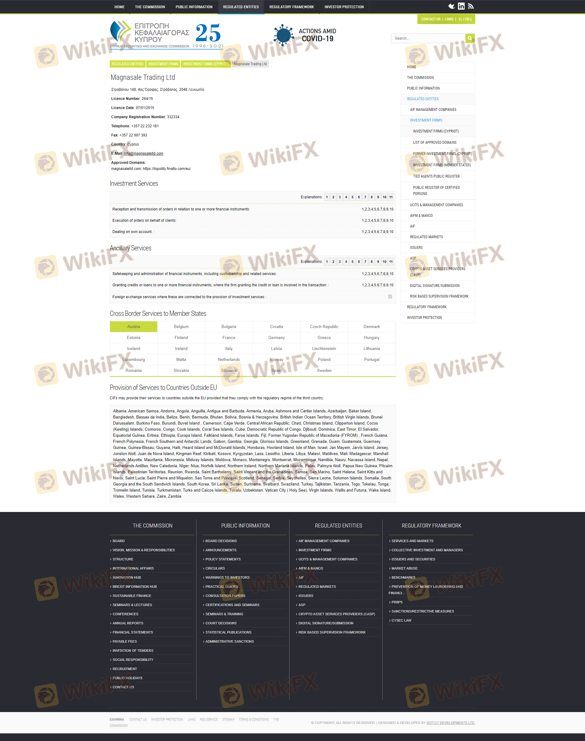 Salah satu aspek pertama yang perlu dipertimbangkan saat mengevaluasi apakah MagnaSale aman atau penipuan adalah status regulasinya. Regulasi berfungsi sebagai langkah perlindungan bagi trader, memastikan broker mematuhi standar dan praktik tertentu. MagnaSale mengklaim diatur oleh Cyprus Securities and Exchange Commission (CySEC), yang merupakan badan regulasi terkemuka di UE. Namun, pemeriksaan lebih lanjut mengungkap beberapa ketidaksesuaian dalam klaimnya.