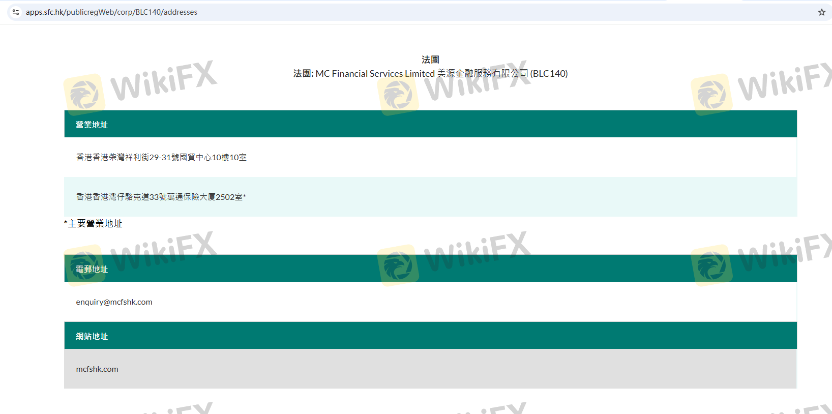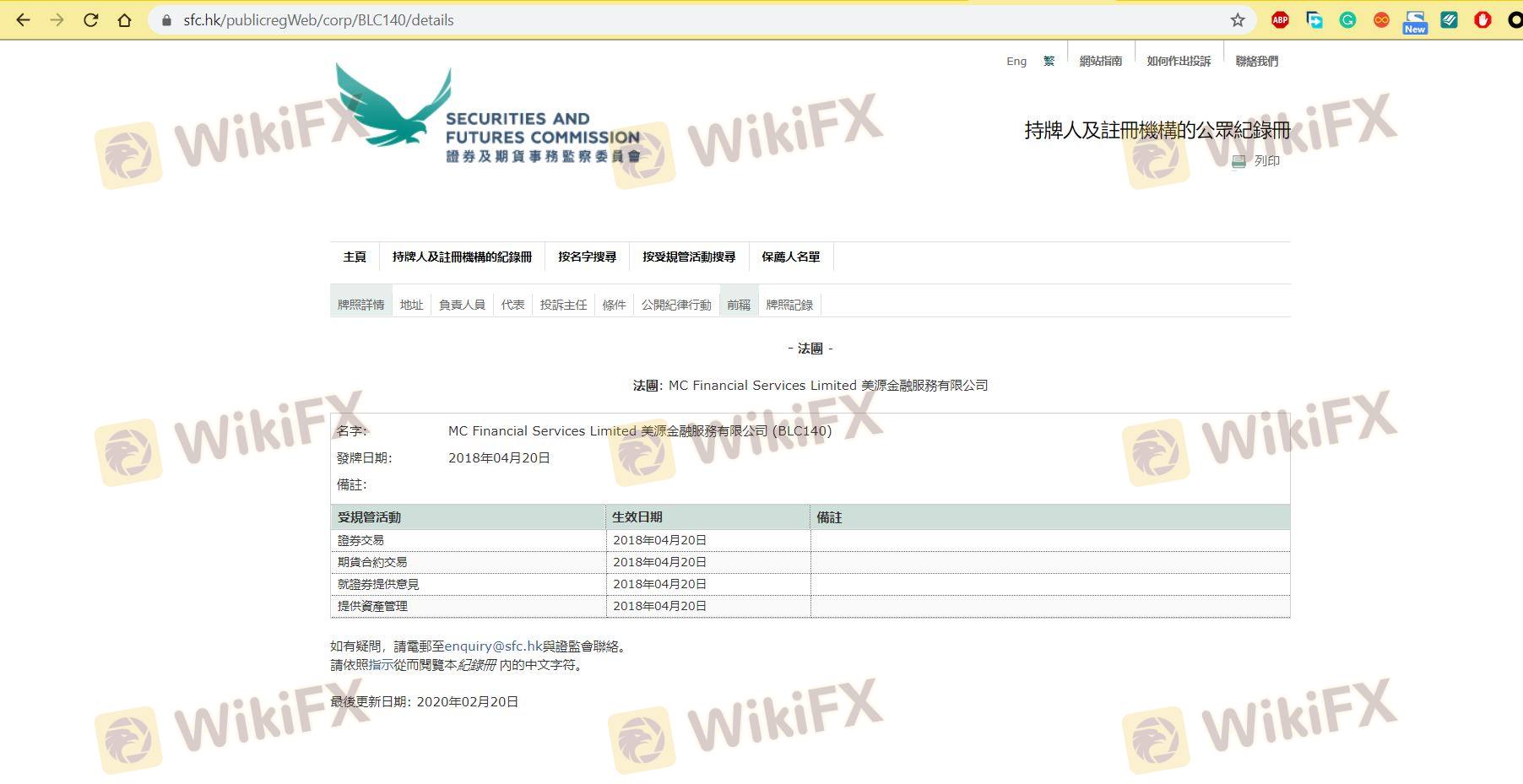 Mengenai legitimasi broker forex MC, ia menyediakan Hong Kong SFC, dan (Kami juga melakukan investigasi lapangan terkait aspek keamanan.).
