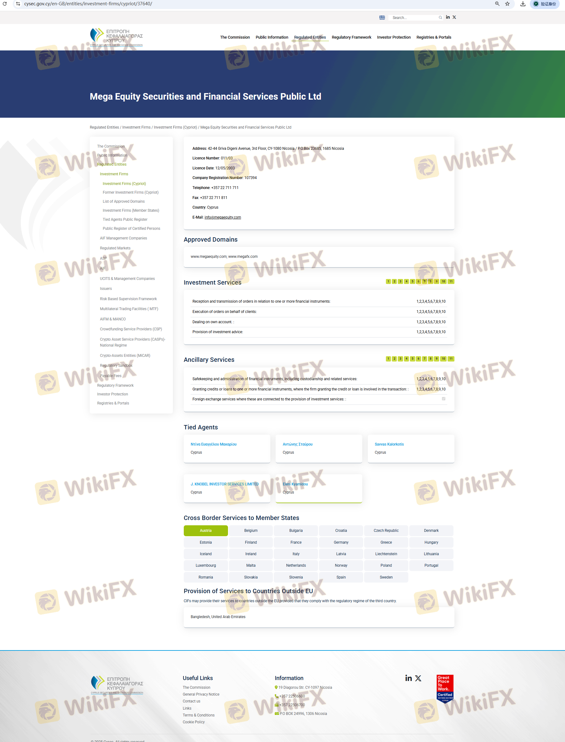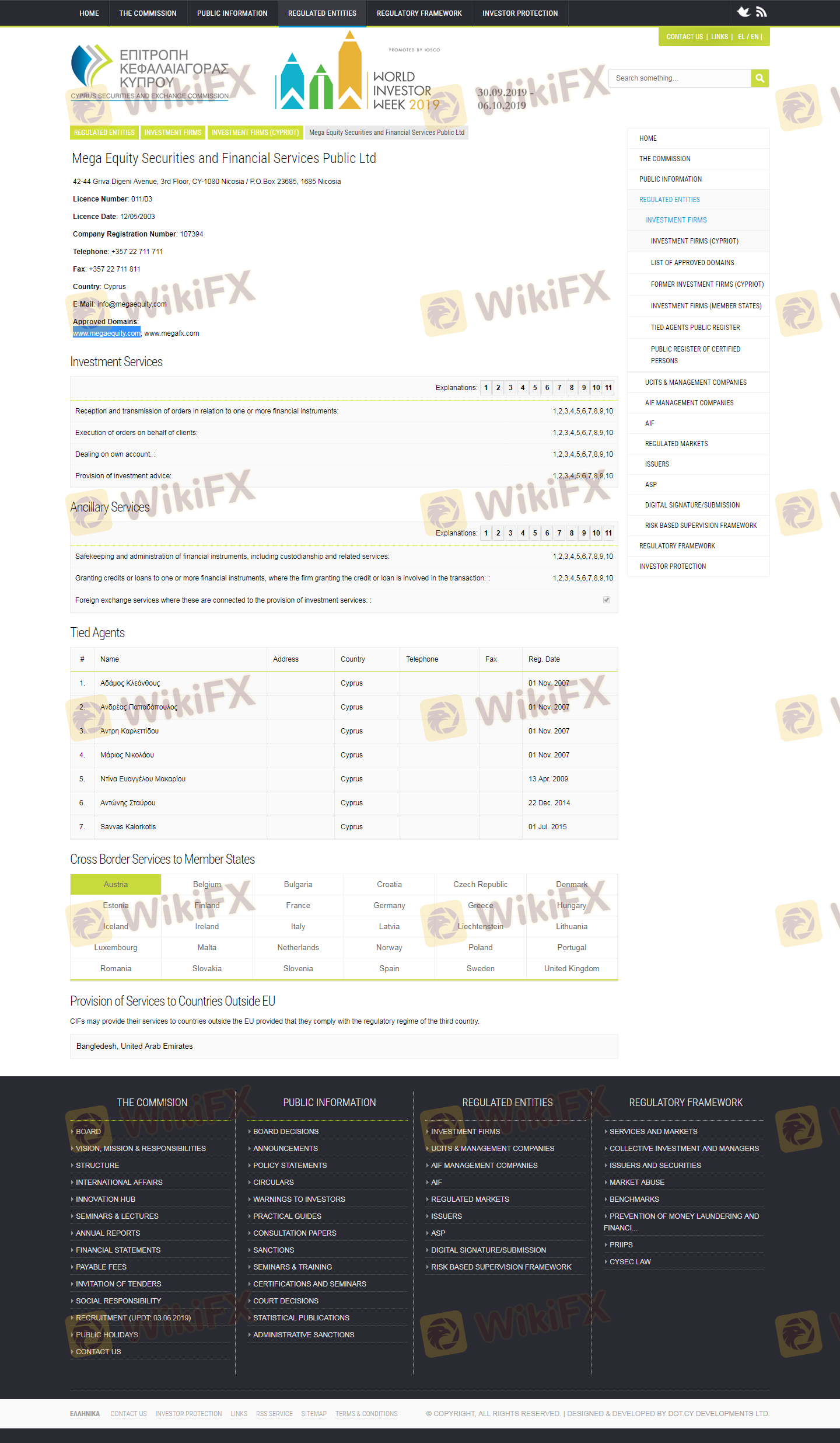 Status regulasi sebuah pialang adalah salah satu faktor terpenting yang harus dipertimbangkan ketika menilai keamanannya. Mega Equity mengklaim diatur oleh Cyprus Securities and Exchange Commission (CySEC), yang dikenal karena menerapkan standar kepatuhan ketat untuk perusahaan keuangan yang beroperasi di wilayah hukumnya. Seorang pialang yang diatur umumnya dianggap lebih aman, karena harus mematuhi peraturan yang melindungi dana klien dan memastikan praktik perdagangan yang adil.
