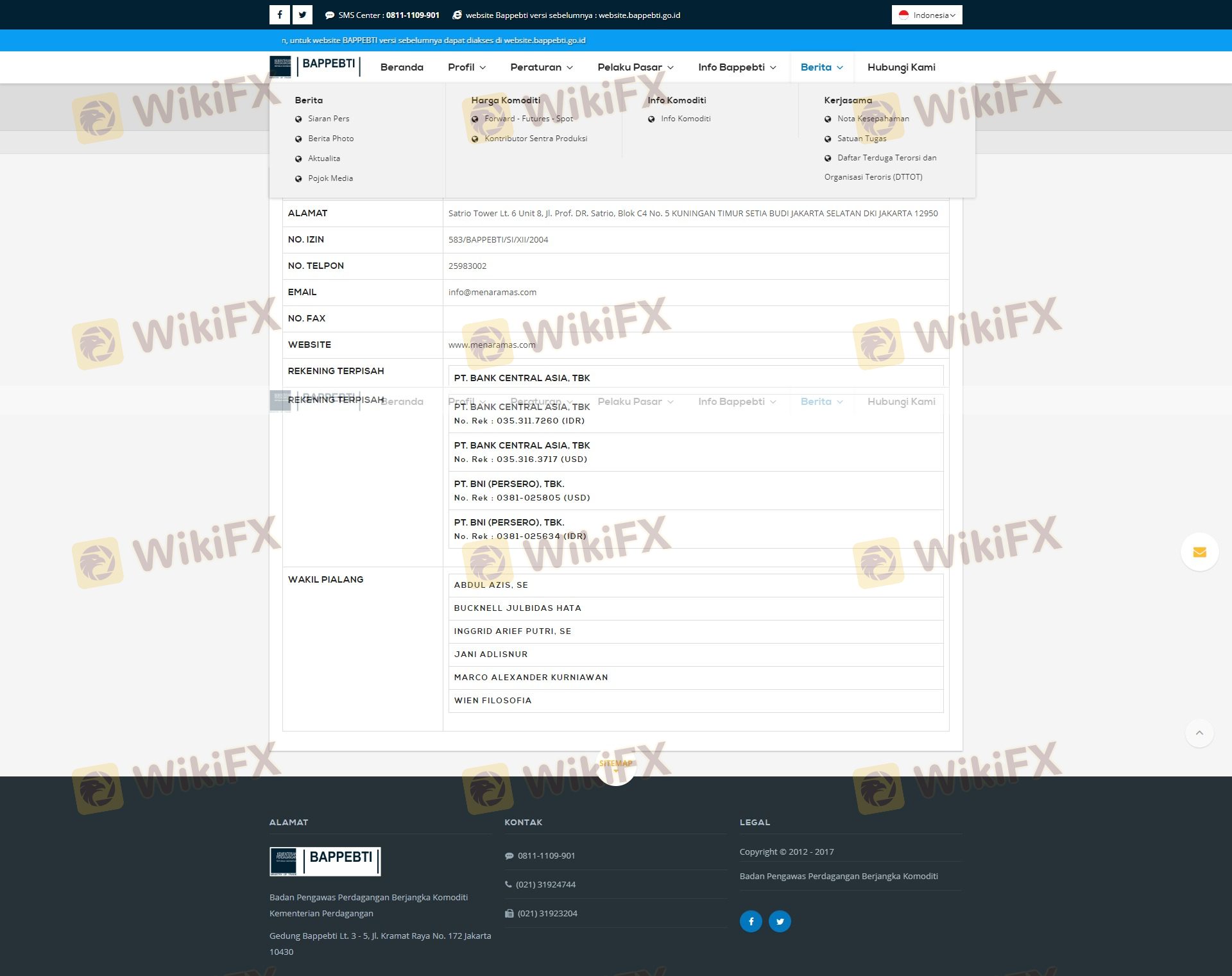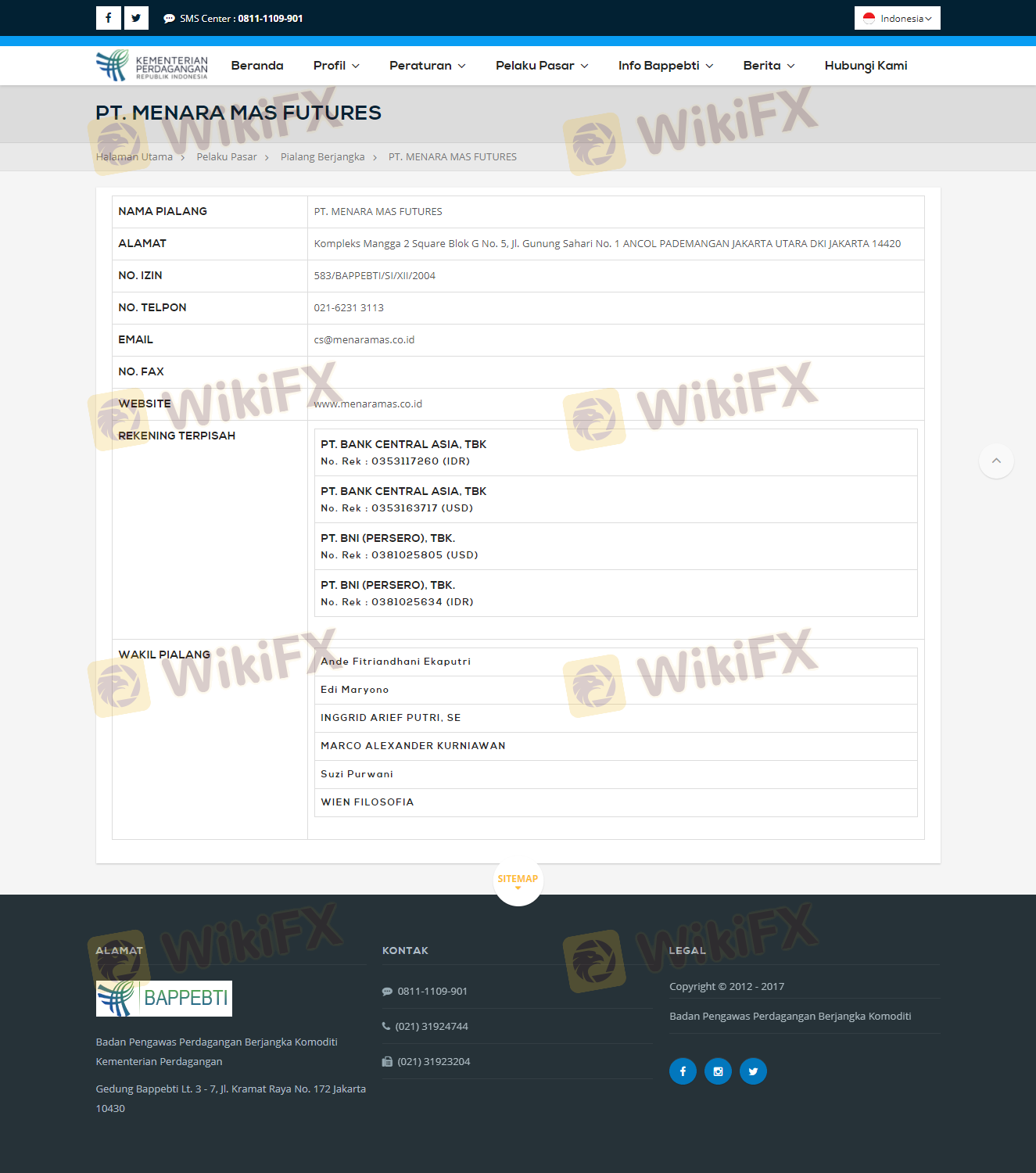 Mengenai legitimasi broker forex Menara Mas Futures, ia menyediakan Indonesia BAPPEBTI, Indonesia JFX, dan (Kami juga melakukan investigasi lapangan terkait aspek keamanan.).