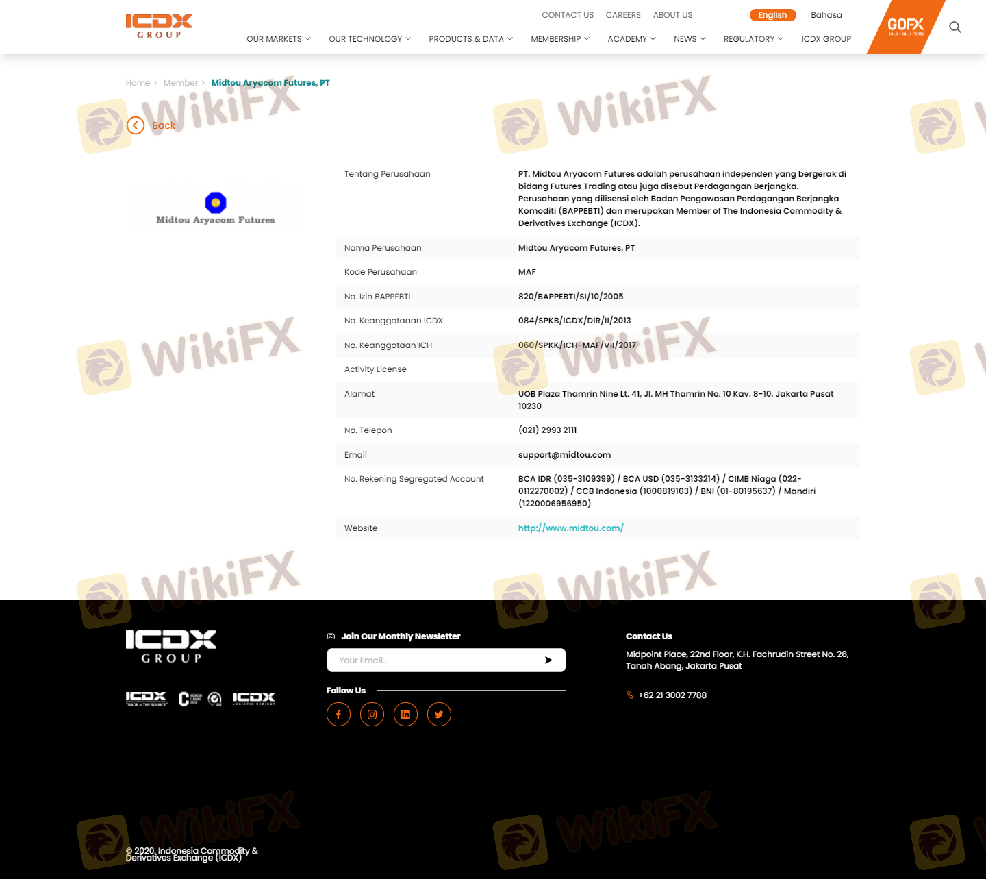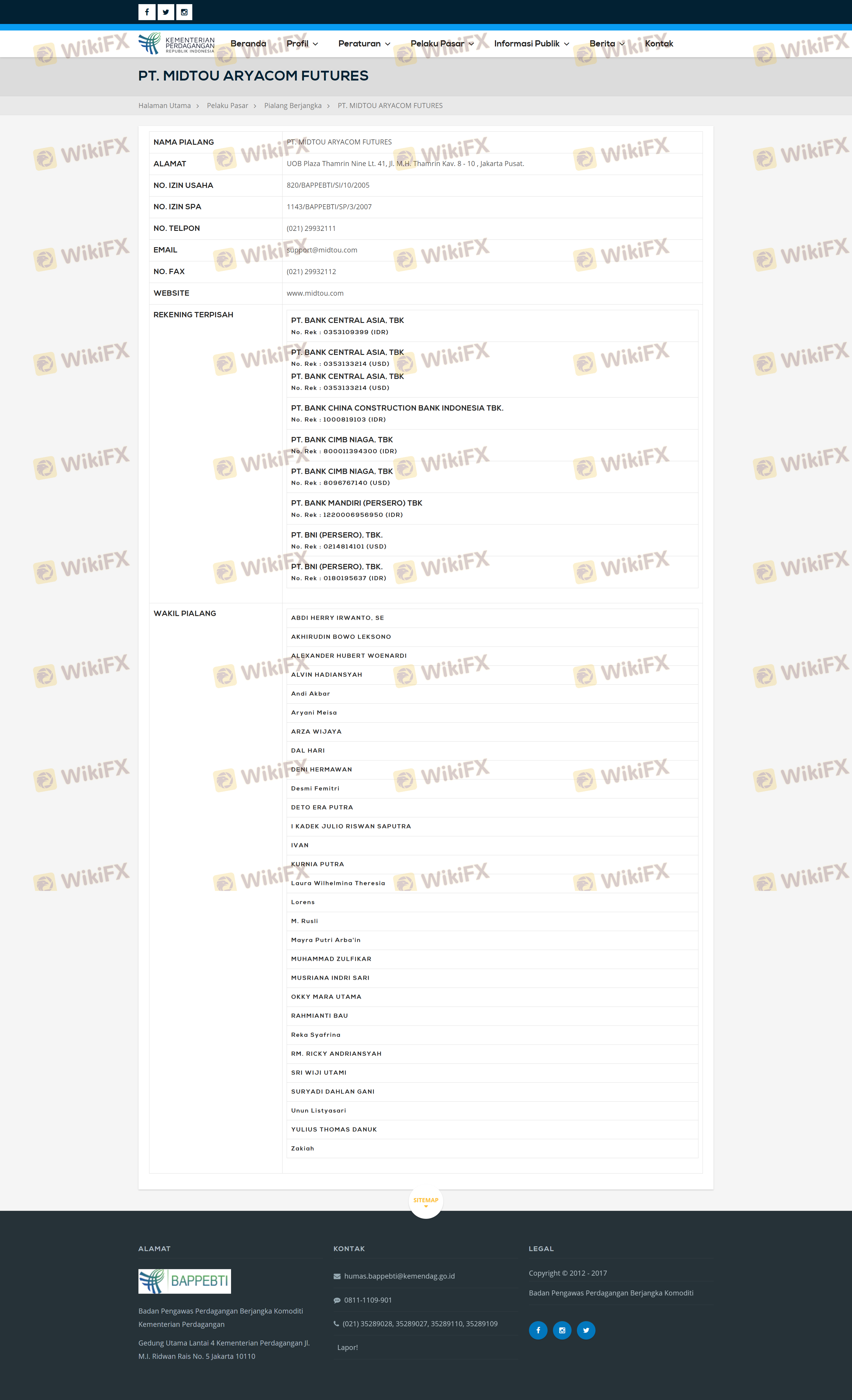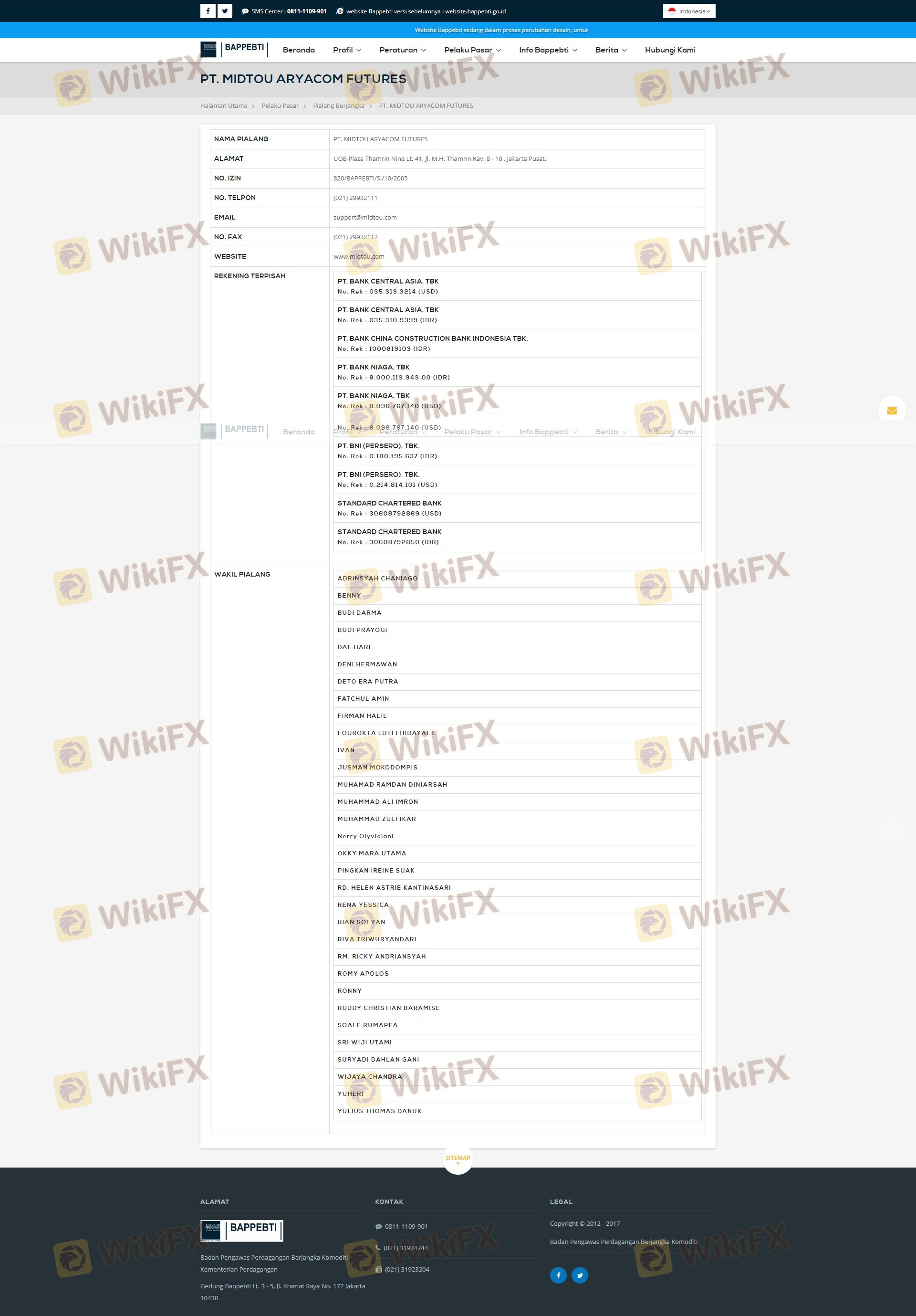 Midtou Aryacom, beroperasi di bawah PT Midtou Aryacom Futures, telah berada di pasar selama lebih dari 18 tahun. Perusahaan ini berkantor pusat di Jakarta, Indonesia, dan menawarkan berbagai instrumen keuangan, termasuk forex, komoditas, dan indeks. Struktur kepemilikan tampak jelas, dengan pendaftaran yang transparan di bawah hukum Indonesia. Namun, informasi terperinci tentang tim manajemen dan latar belakang profesional mereka terbatas, yang memunculkan pertanyaan tentang transparansi perusahaan.
