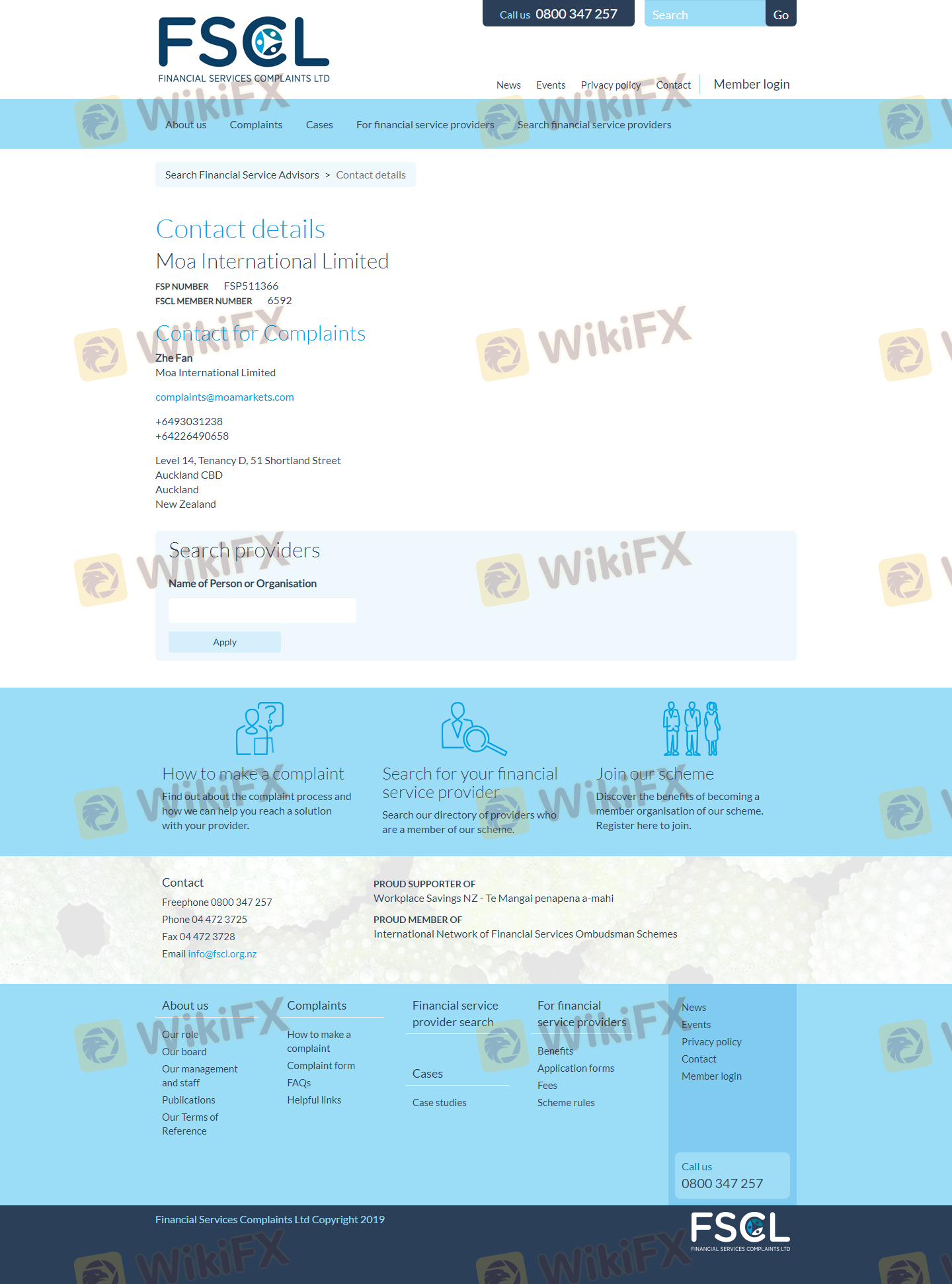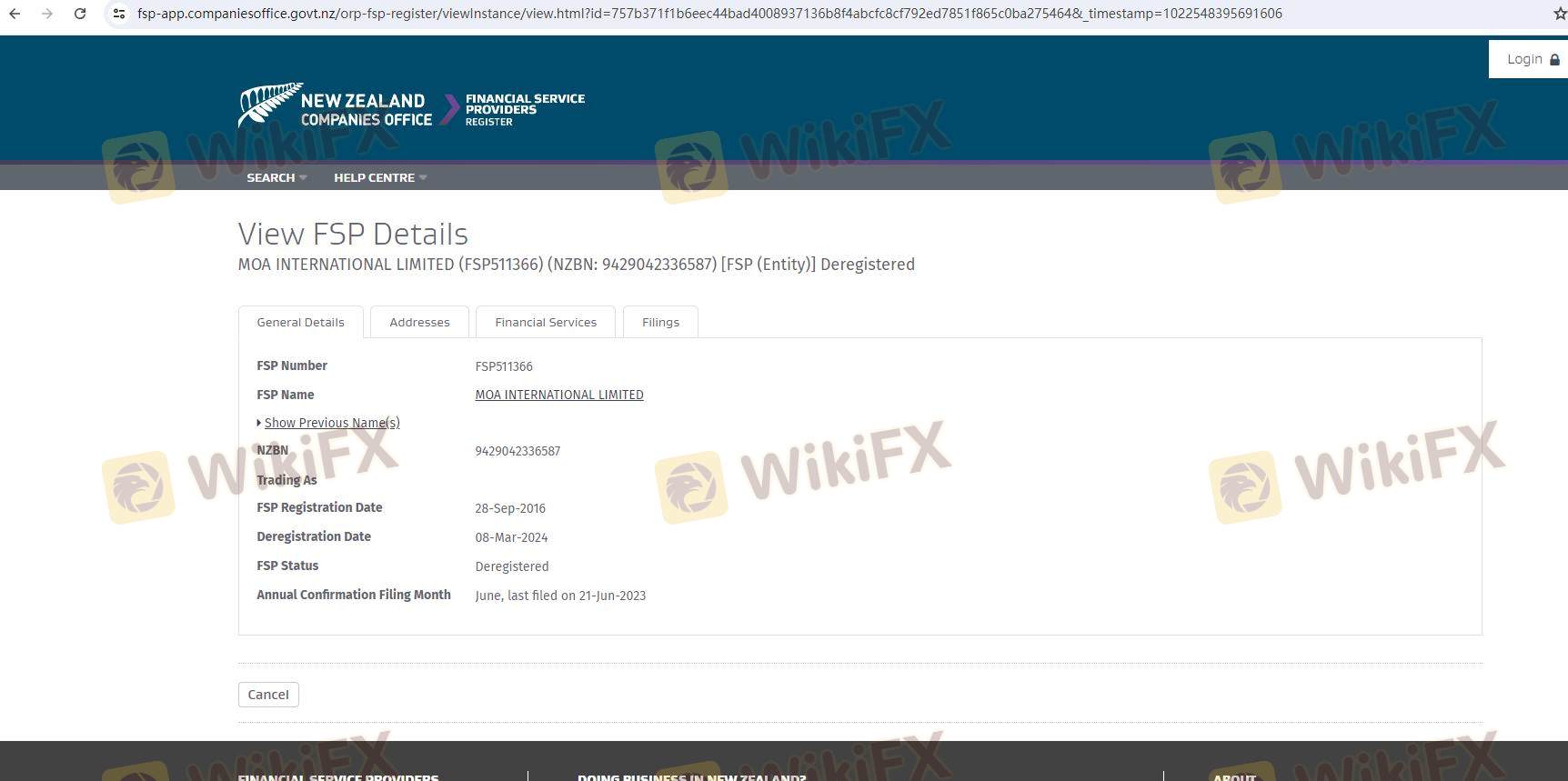 Status regulasi broker forex sangat penting dalam menentukan legitimasinya. Broker yang beroperasi di bawah badan regulasi terkemuka biasanya dianggap lebih dapat dipercaya. Moa terdaftar di Financial Service Providers Register (FSPR) di Selandia Baru, tetapi telah menghadapi pengawasan karena skor rendah di platform seperti WikiFX, yang memberinya nilai 1,59 dari 10. Skor ini menunjukkan potensi masalah dengan transparansi dan keandalan.