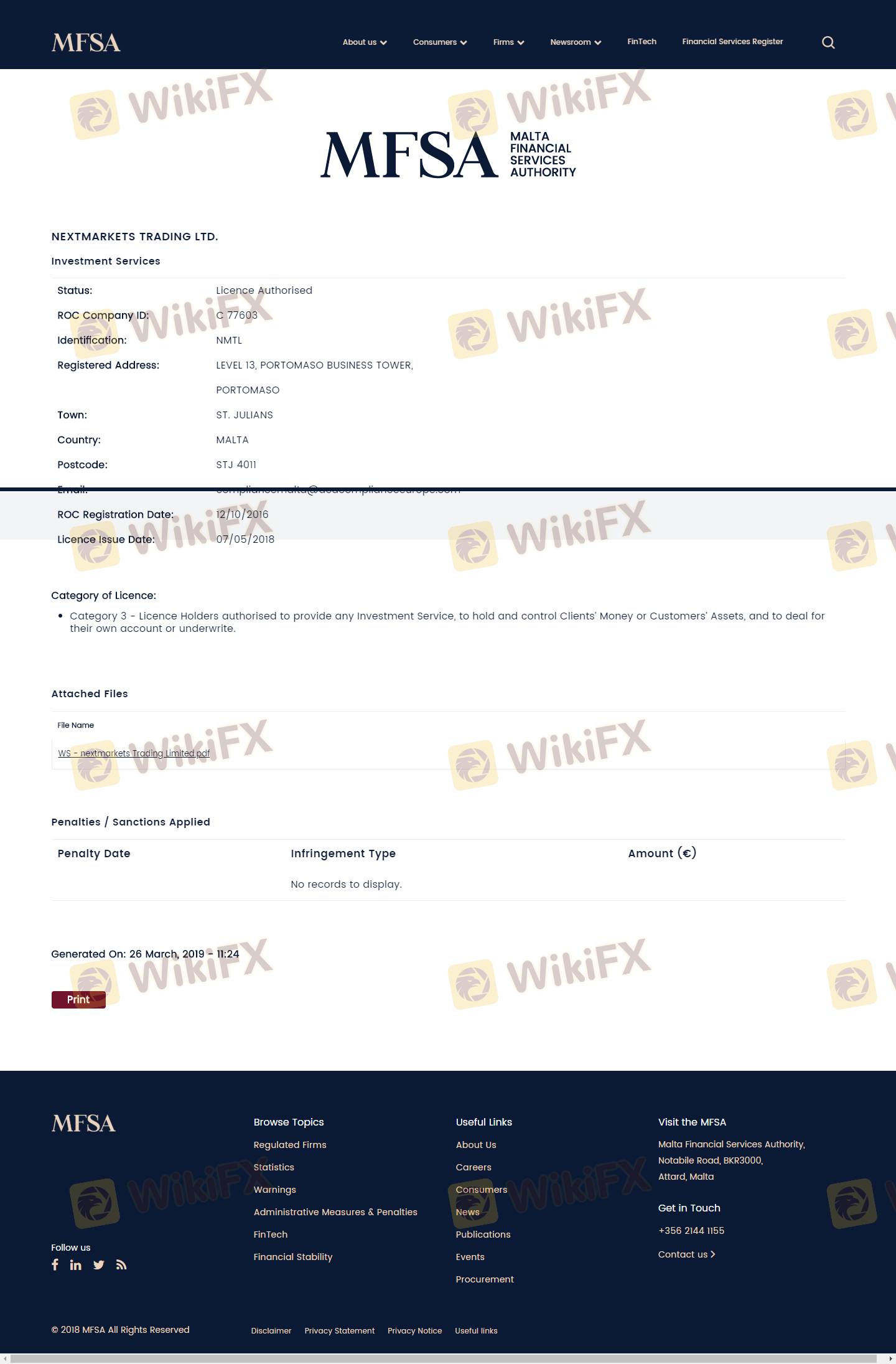 Nextmarkets diatur oleh Malta Financial Services Authority (MFSA), yang memberikan tingkat kredibilitas dan jaminan tertentu kepada kliennya. Regulasi adalah aspek kritis dari setiap broker, karena memastikan bahwa broker mematuhi standar tertentu yang melindungi investor. Berikut adalah ringkasan informasi regulasi Nextmarkets: